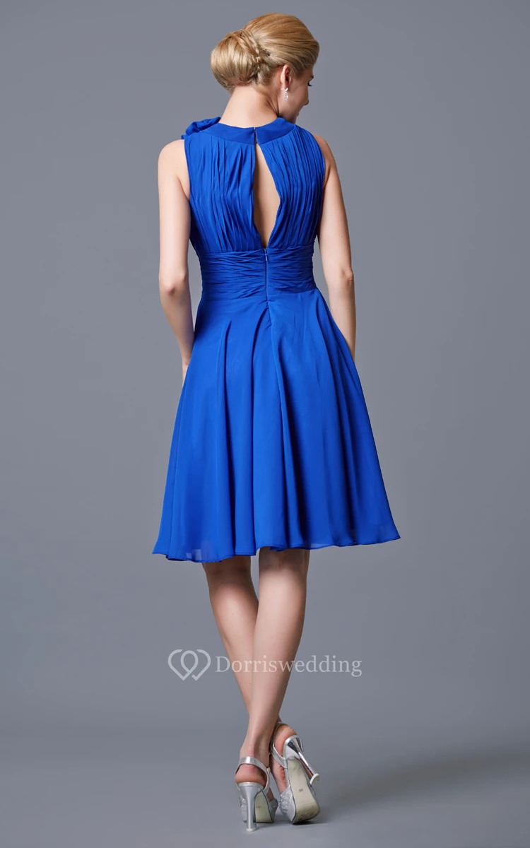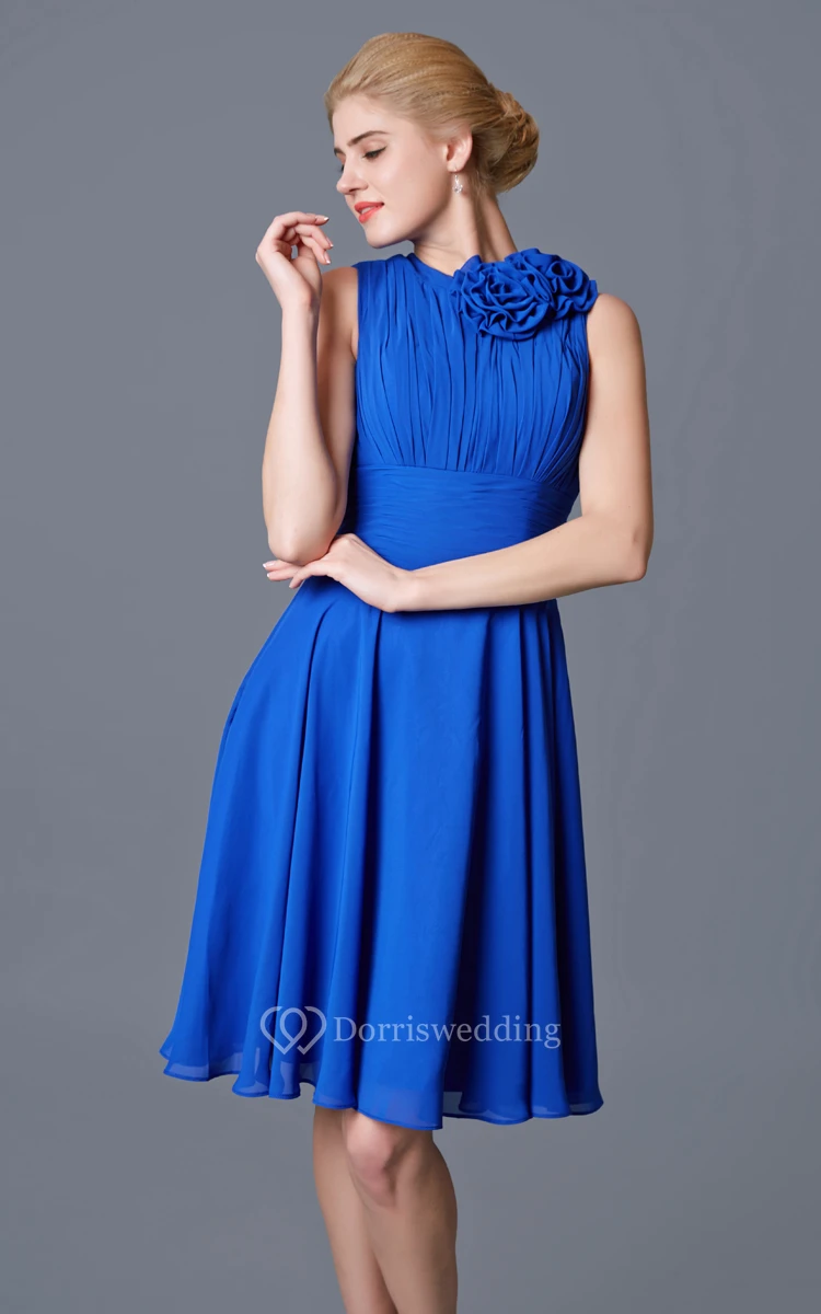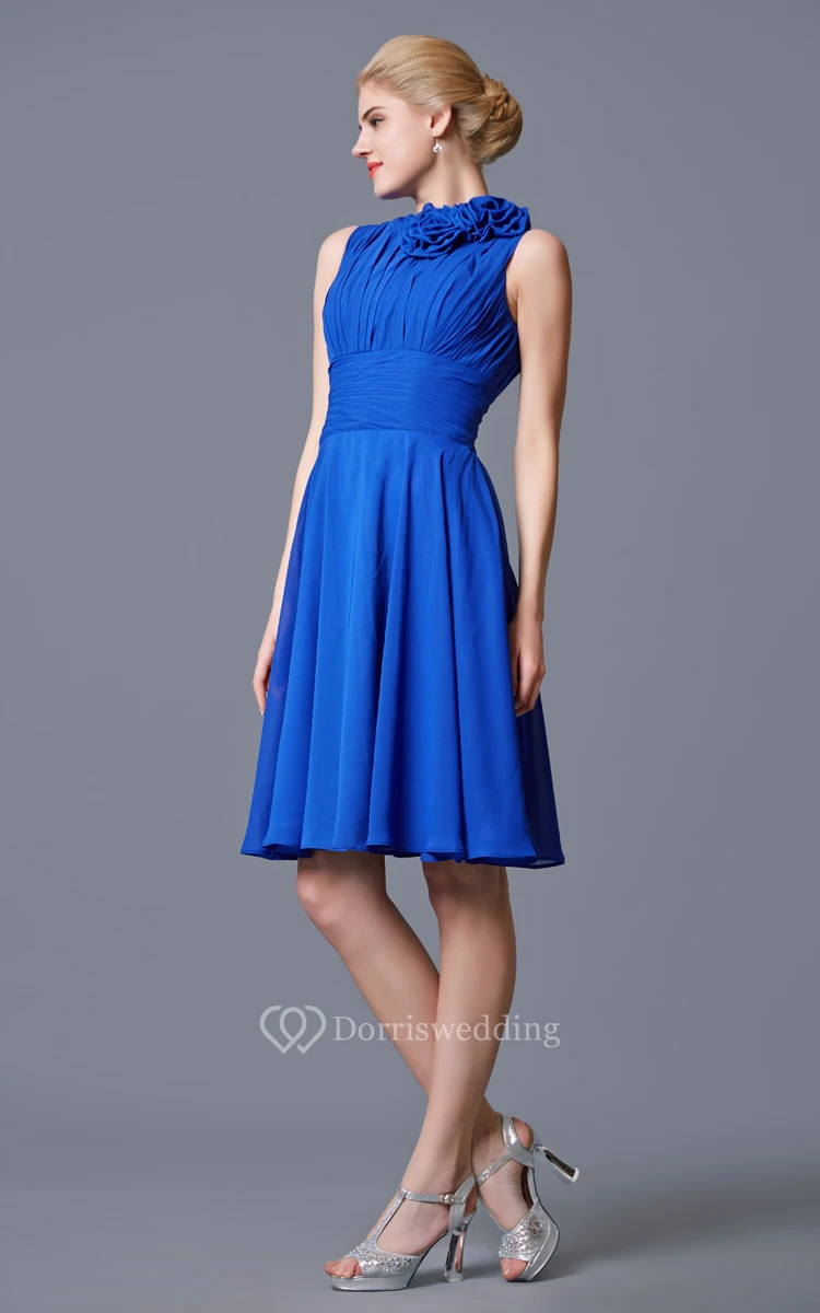 High Neck Empire Short Chiffon A-line Dress With Flowers and Ruching