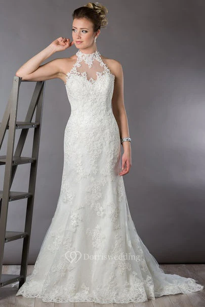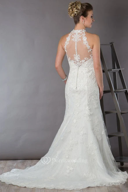 High Neck Illusion Back Sheath Bridal Gown With Allover Lace