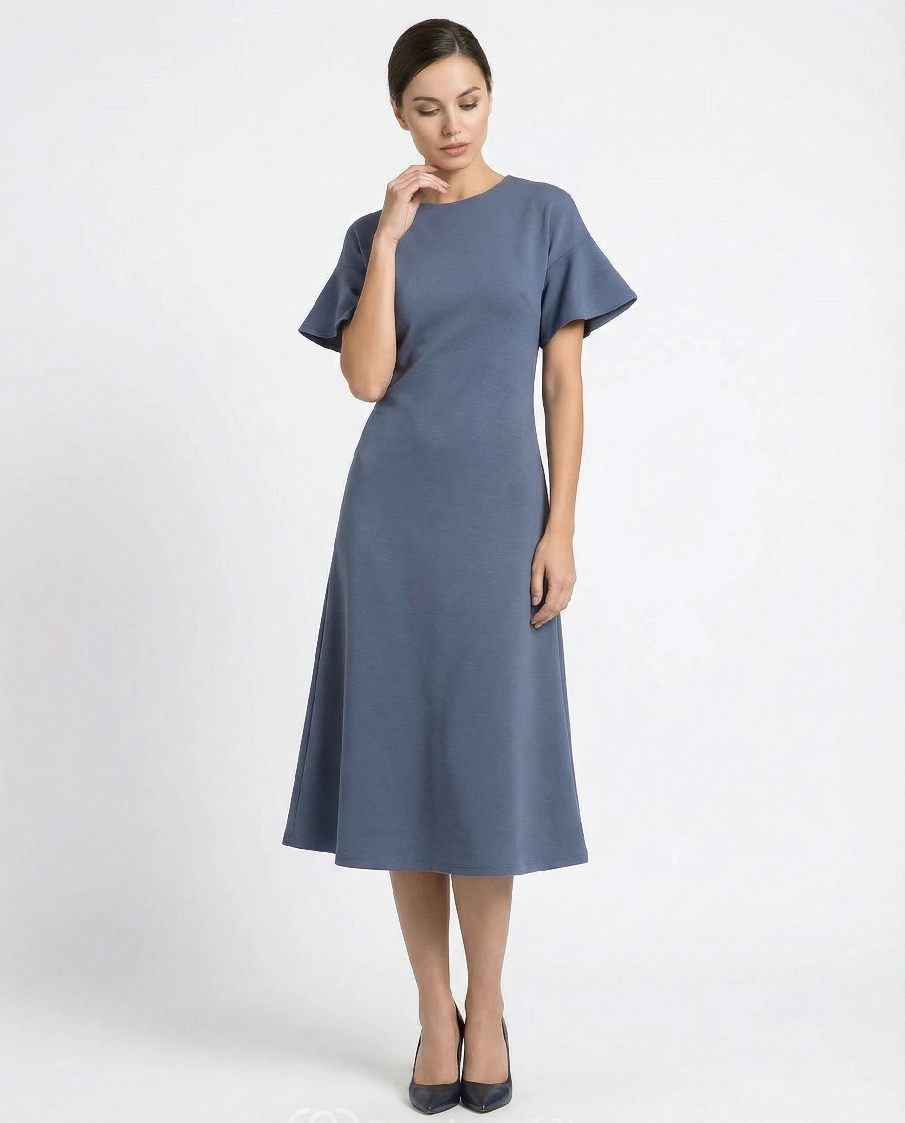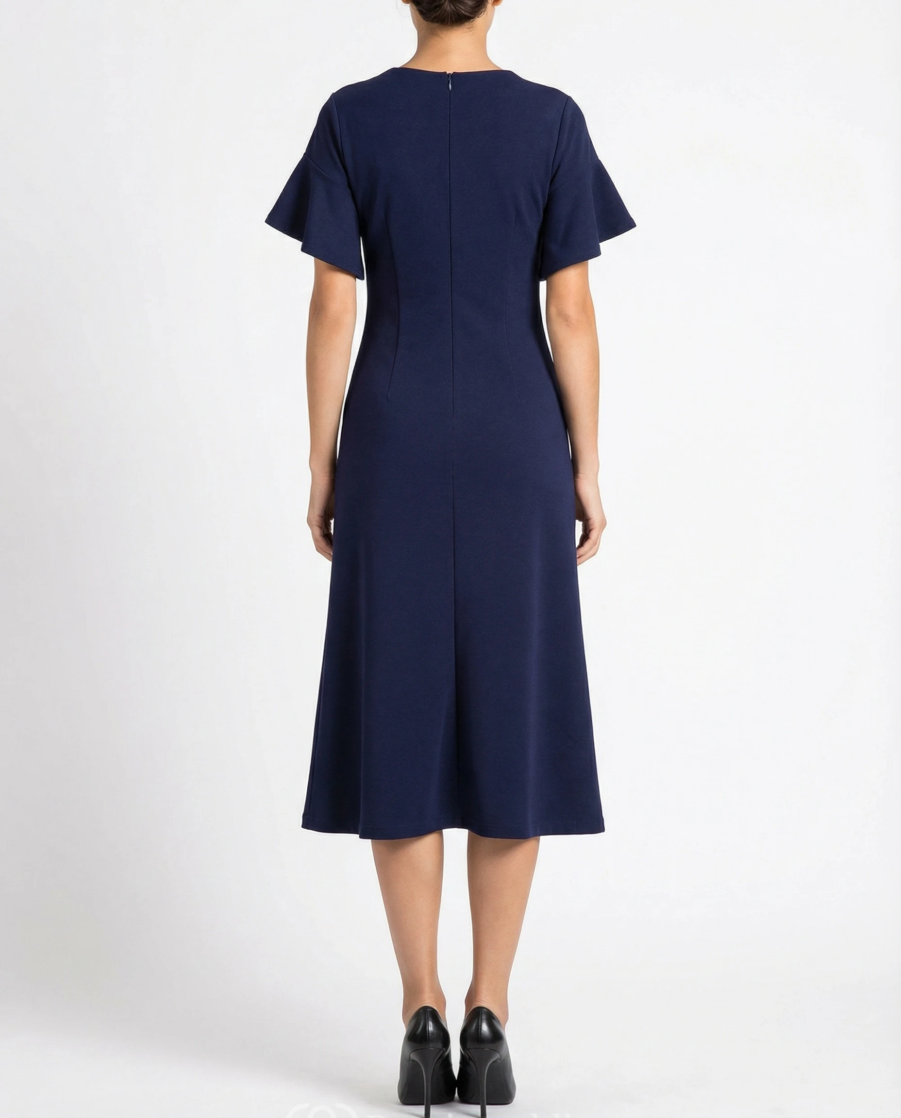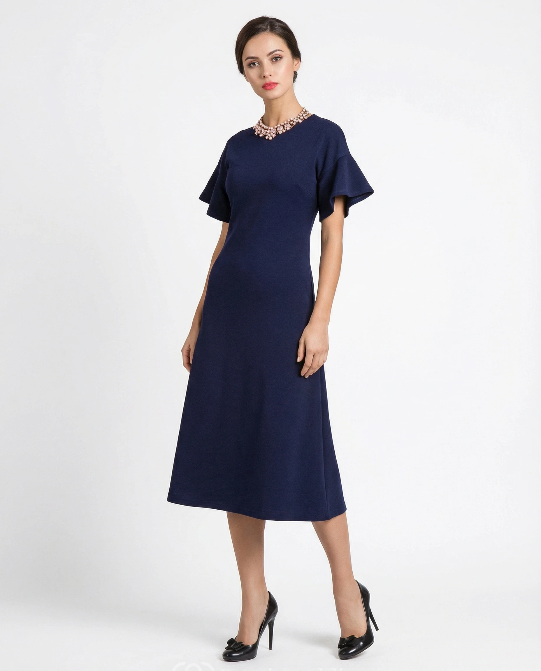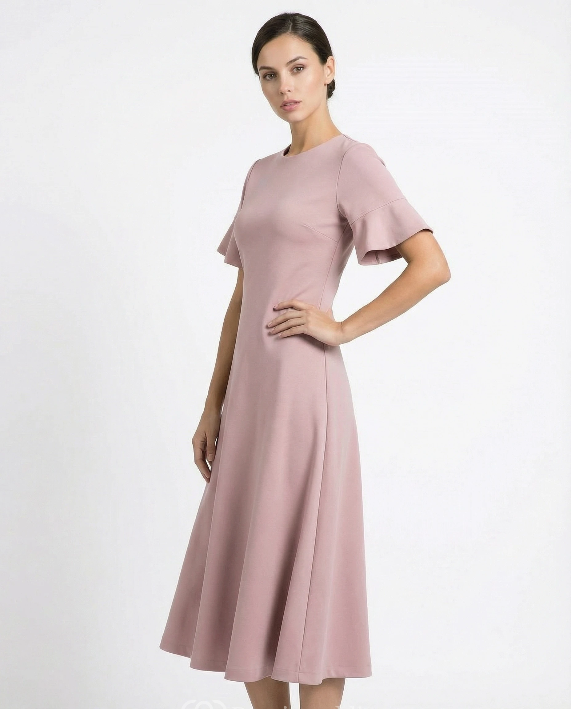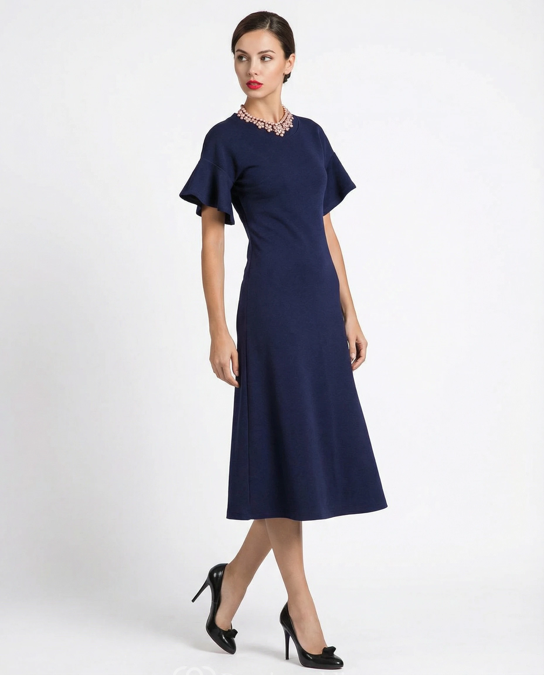High Neck Jersey A-Line Dress with Bell Sleeves