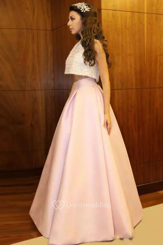 High Neck Jewel Two Piece Floor-length Sleeveless Satin Prom Dress with Zipper Back