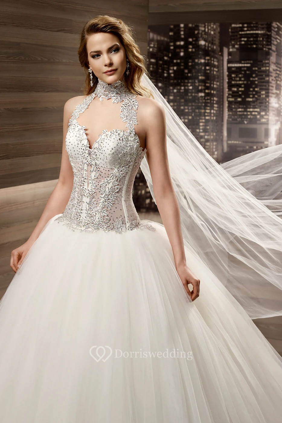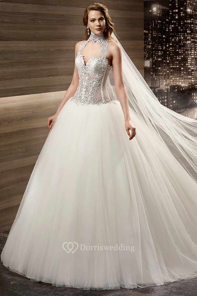 High-Neck Keyhole A-Line Bridal Gown With Beaded Bodice And Pleated Skirt