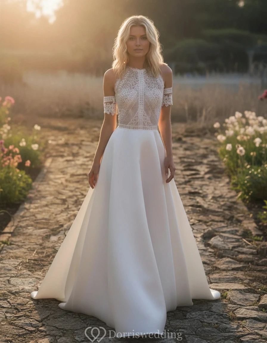 I absolutely loved wearing this dress. The high neck is so pretty and the cold shoulder cutouts are very flattering. The satin skirt moves beautifully. I felt so unique and special on my wedding day. It’s a great choice for any bride who wants a modern and stylish boho look. The quality of both the lace and satin is excellent.