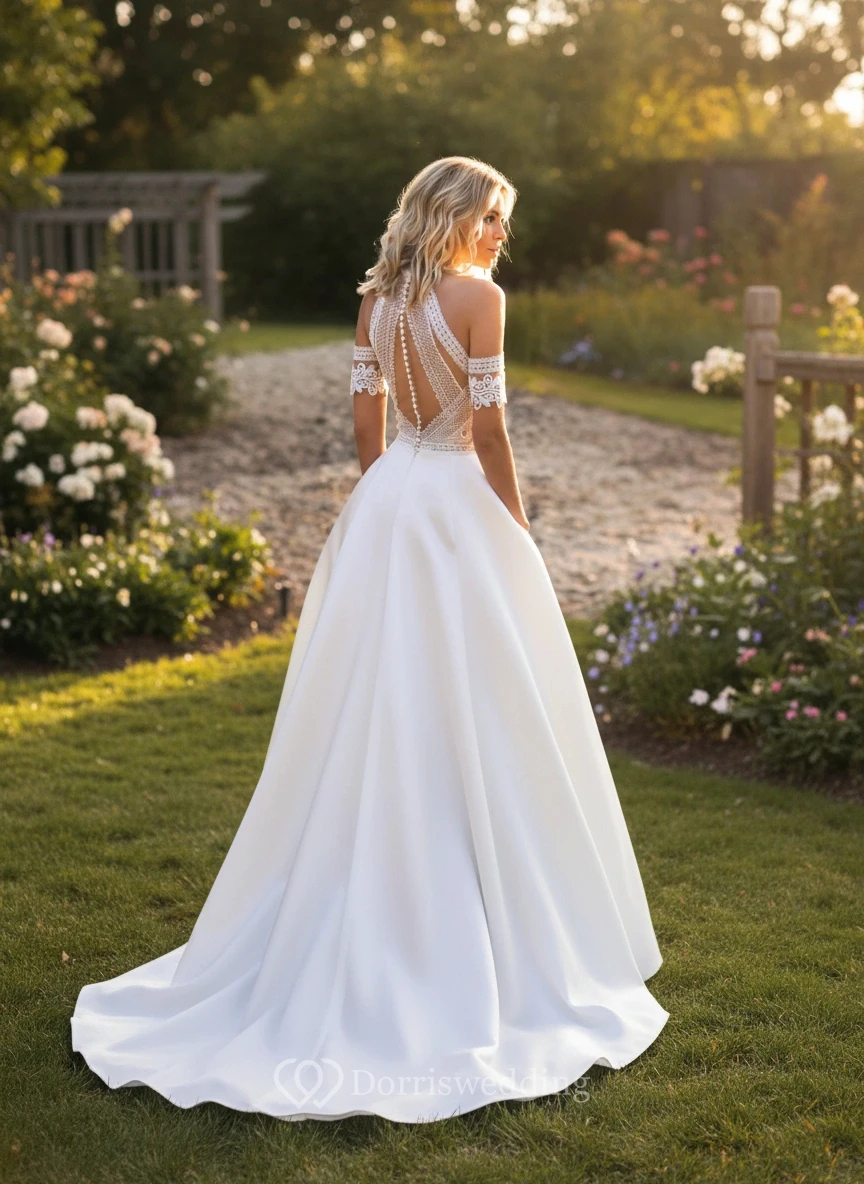 If you're looking for a beautiful and unique modern boho wedding dress, this is it. The combination of the high neck, cold shoulder, and satin skirt is just stunning. I felt so stylish in this gown. The lace is very detailed and the fit is perfect. It’s a very special dress that I am so glad I chose for my big day. Highly recommend for a modern bride!