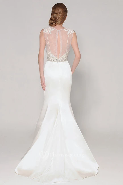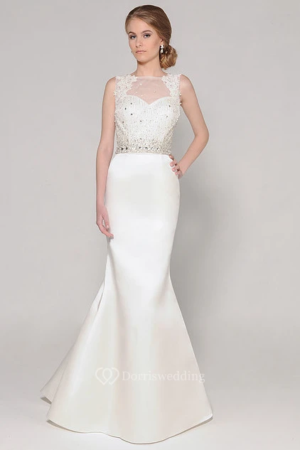 High Neck Long Appliqued Jeweled Satin Wedding Dress With Sweep Train And Illusion