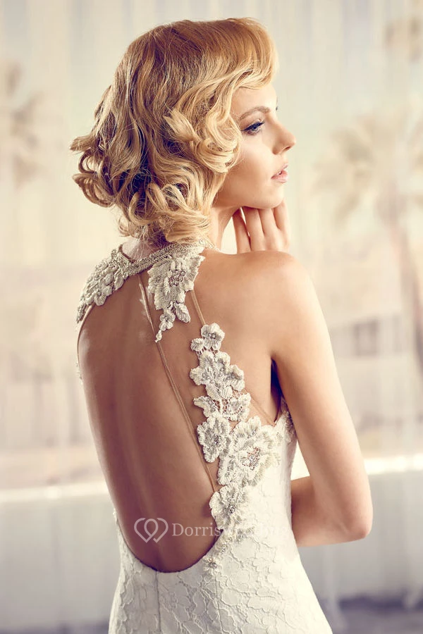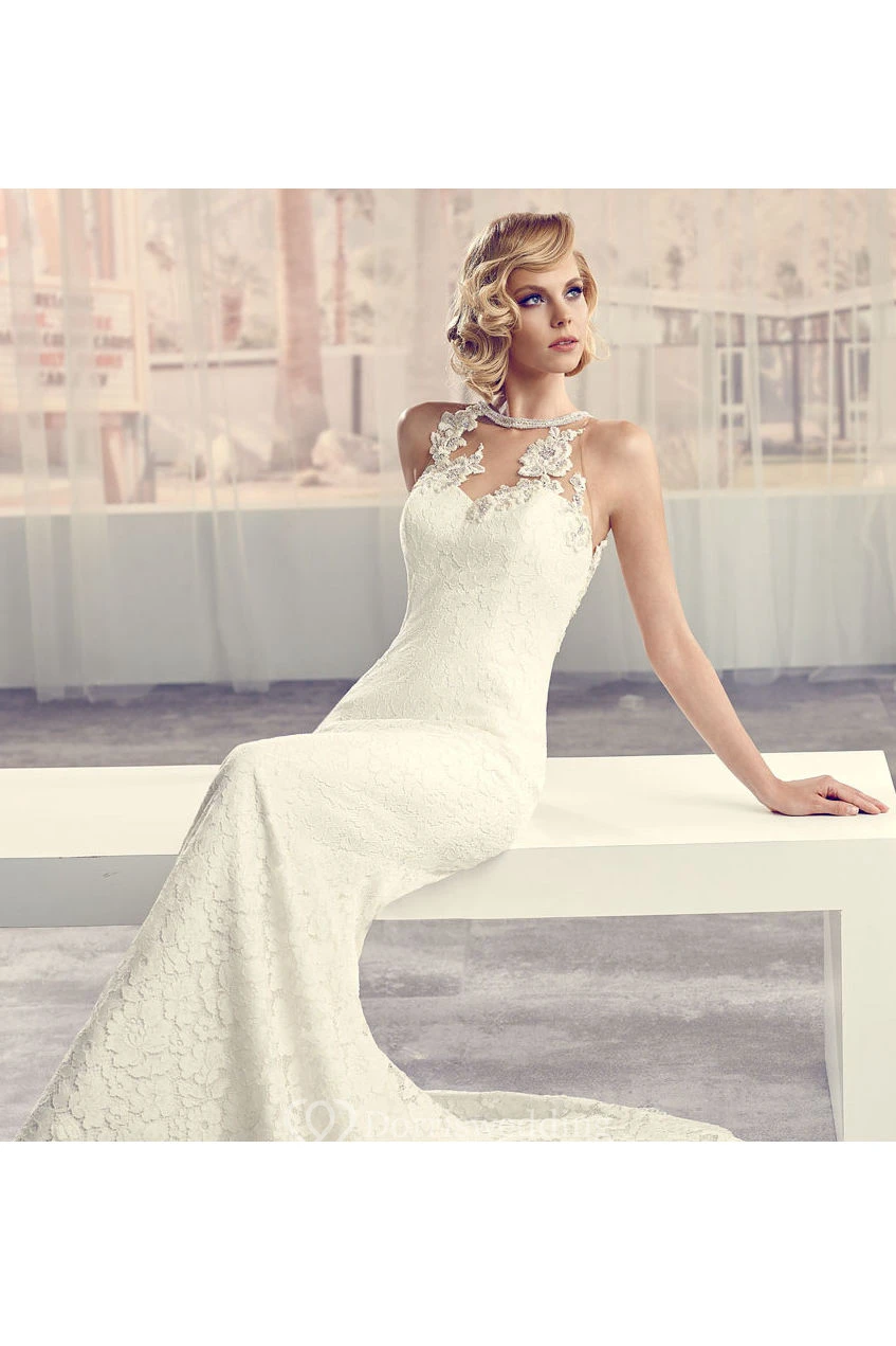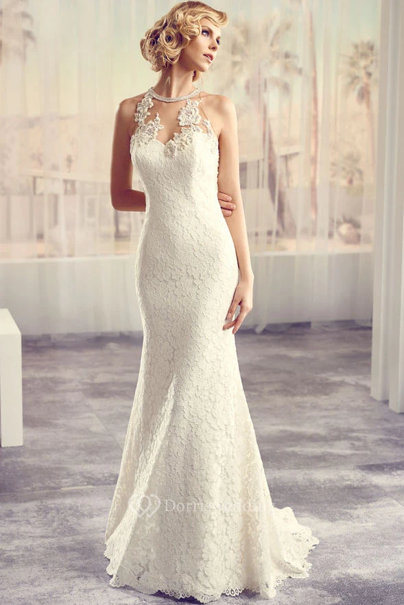 High Neck Long Appliqued Lace Wedding Dress With Court Train And Keyhole