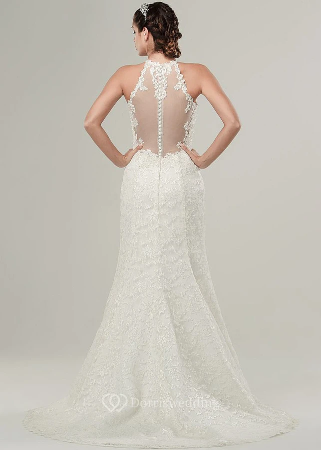 High Neck Long Appliqued Lace Wedding Dress With Sweep Train And Illusion