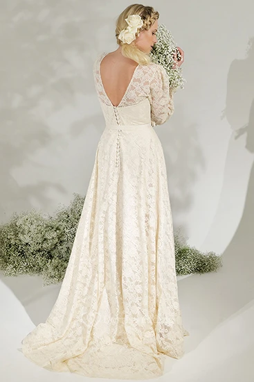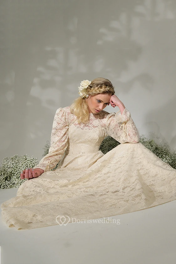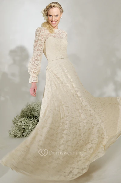High Neck Long Puff-Sleeve Lace Wedding Dress With Sweep Train And V Back