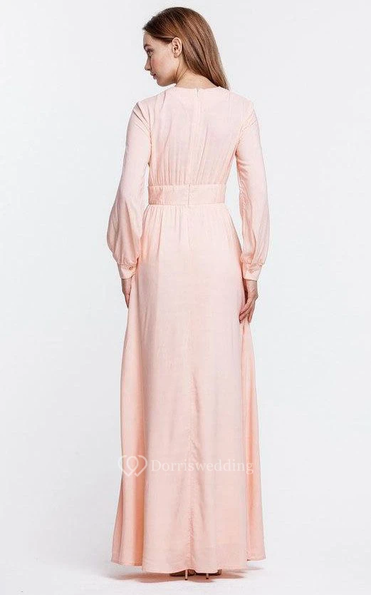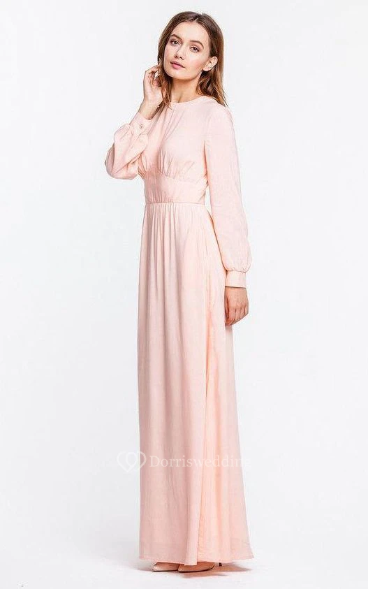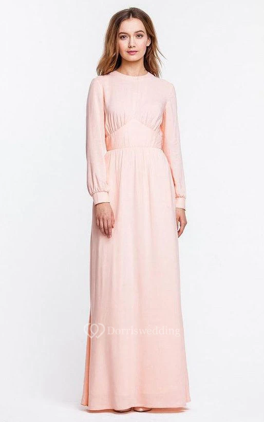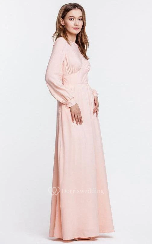 High Neck Long Puff Sleeve Pleated A-line Chiffon Floor Length Dress