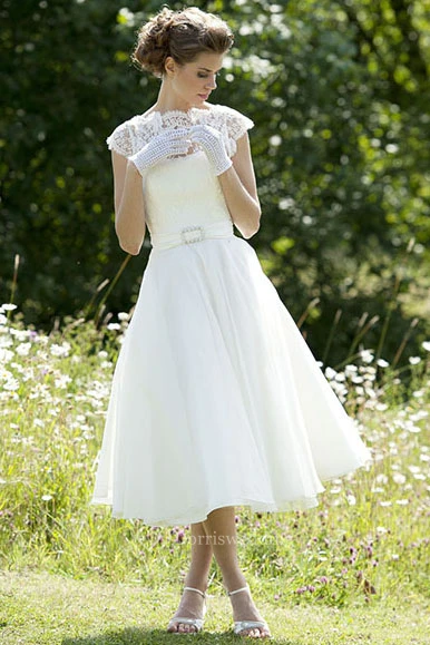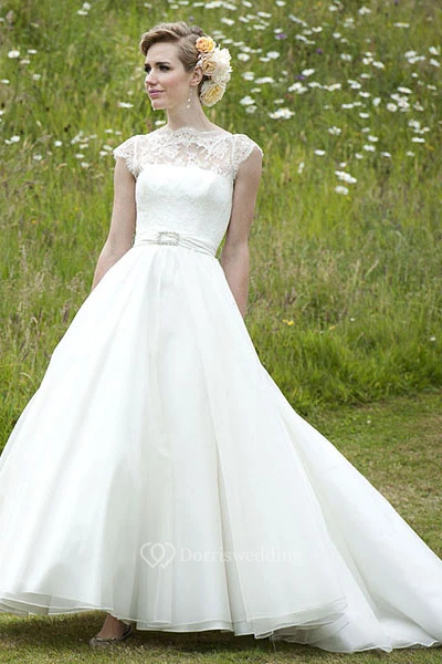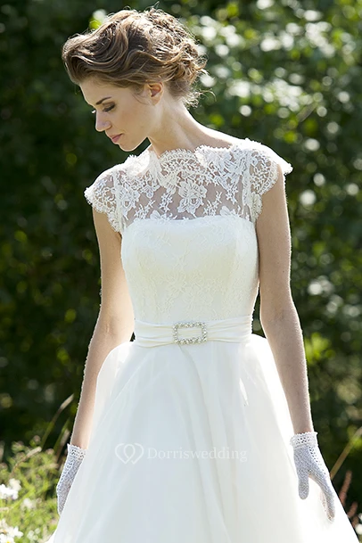 High Neck Maxi Cap-Sleeve Lace Chiffon Wedding Dress