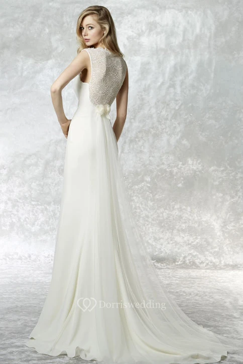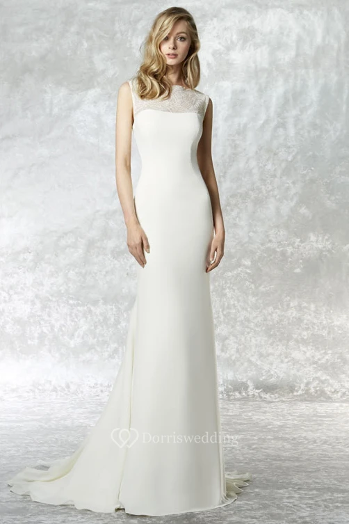 High Neck Maxi Lace Jersey Wedding Dress With Sweep Train And Illusion