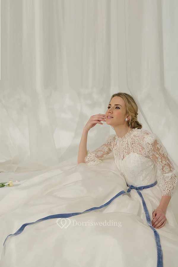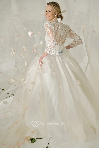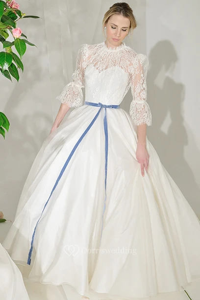 High Neck Maxi Lace Puff-Sleeve Satin Wedding Dress