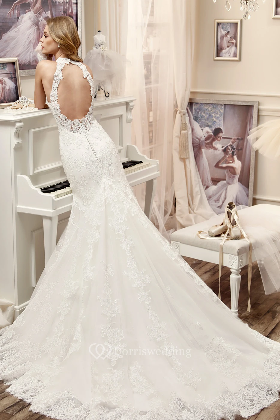 High-Neck Mermaid Lace Wedding Dress With Appliques And Brush Train