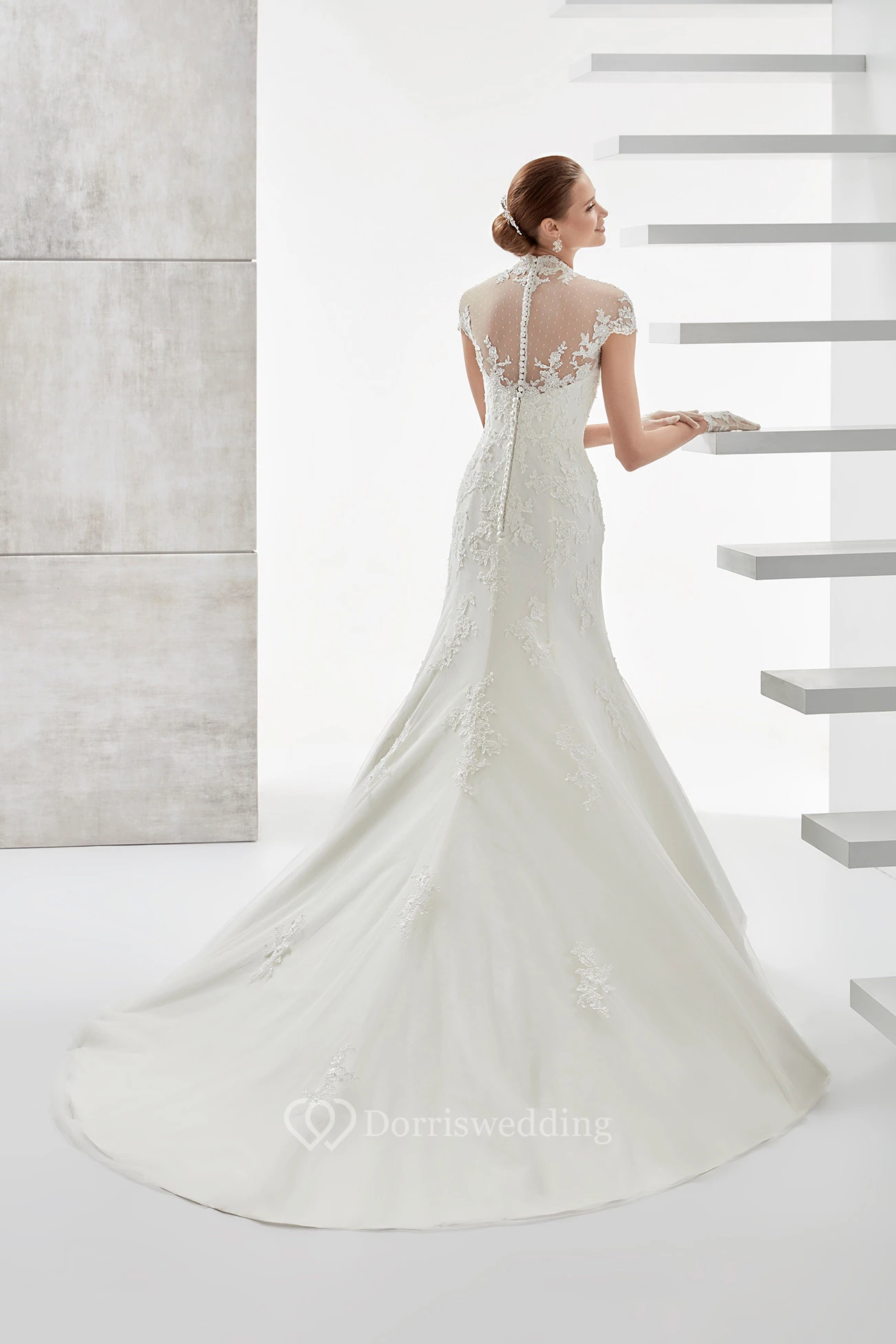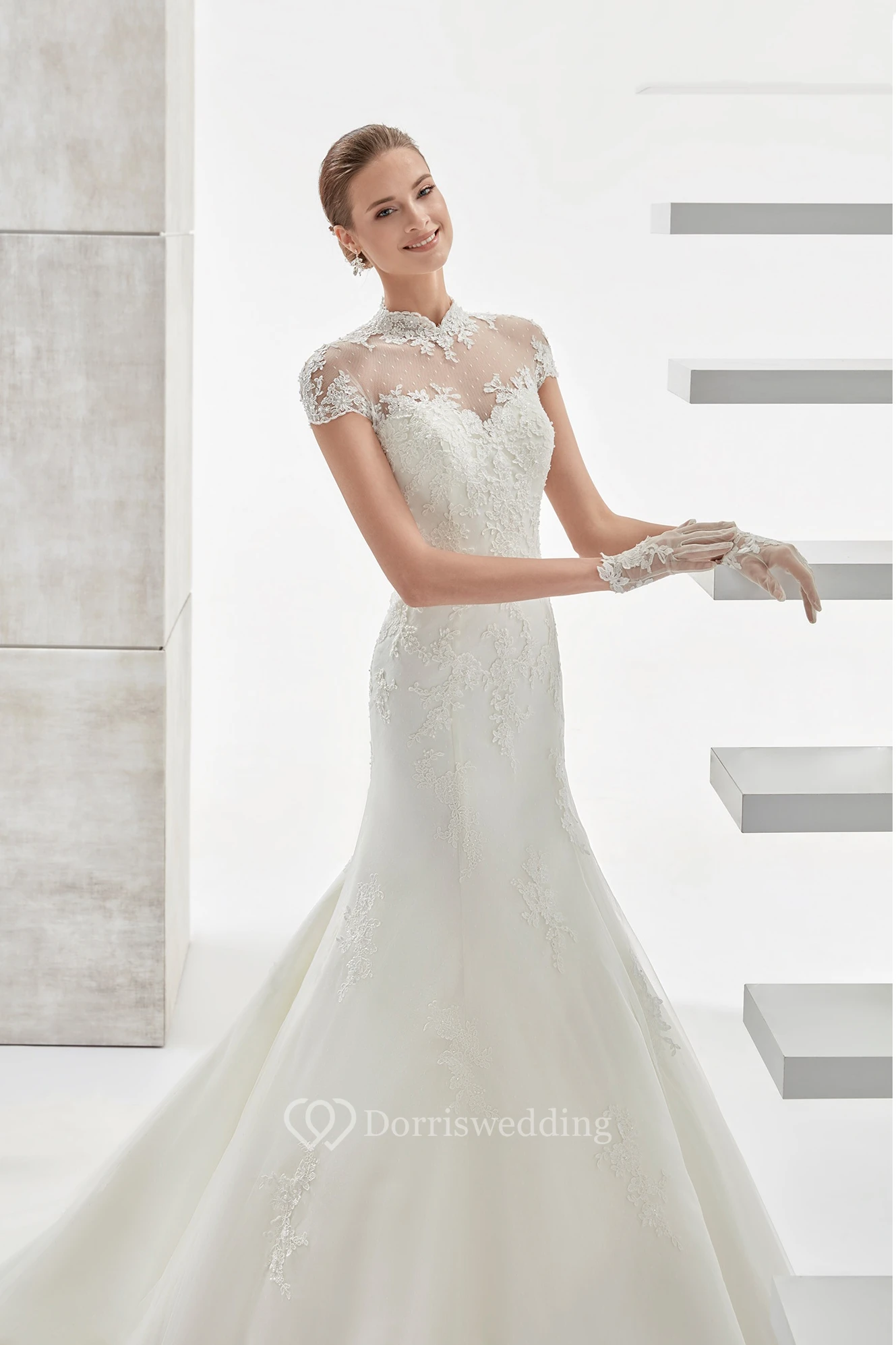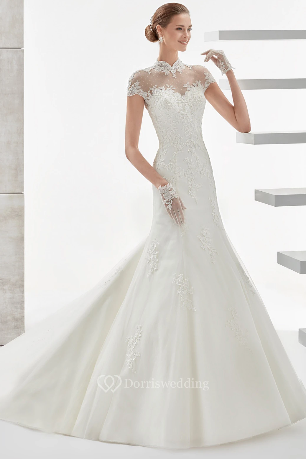 High-Neck Mermaid Long Wedding Dress With T-Shirt Sleeves And Illusive Design
