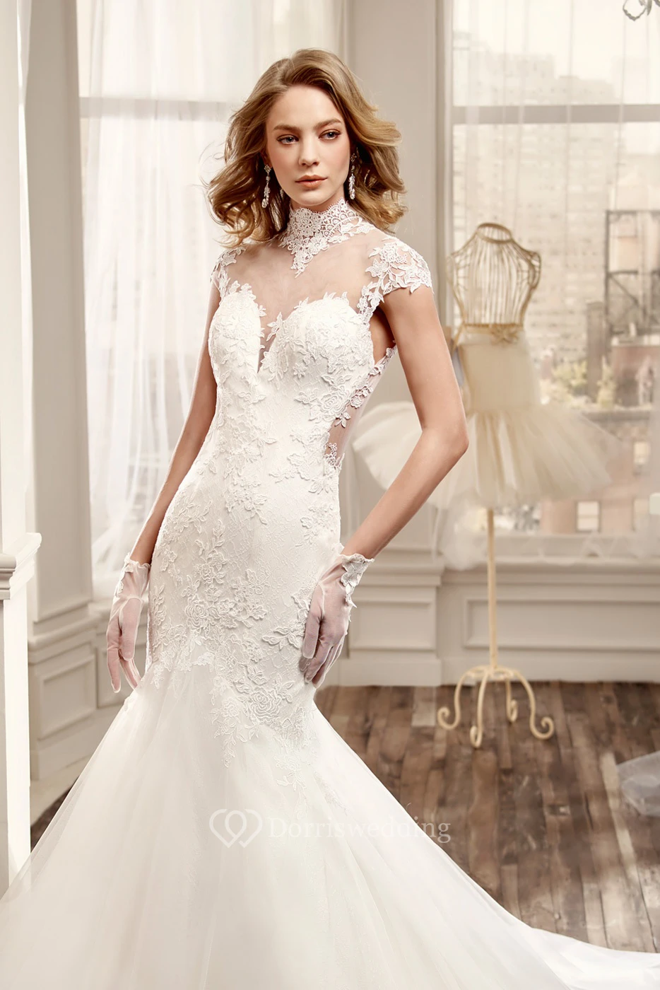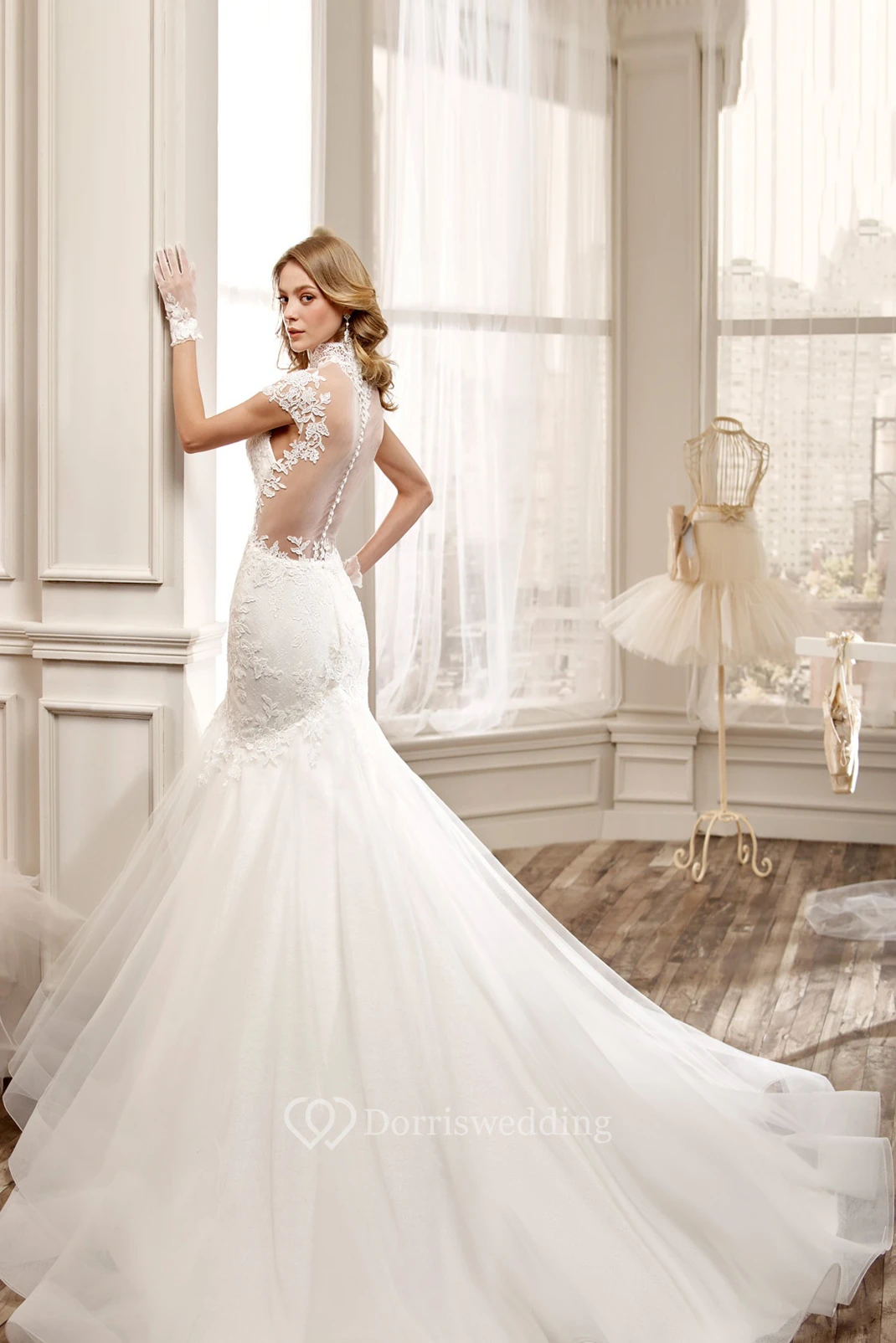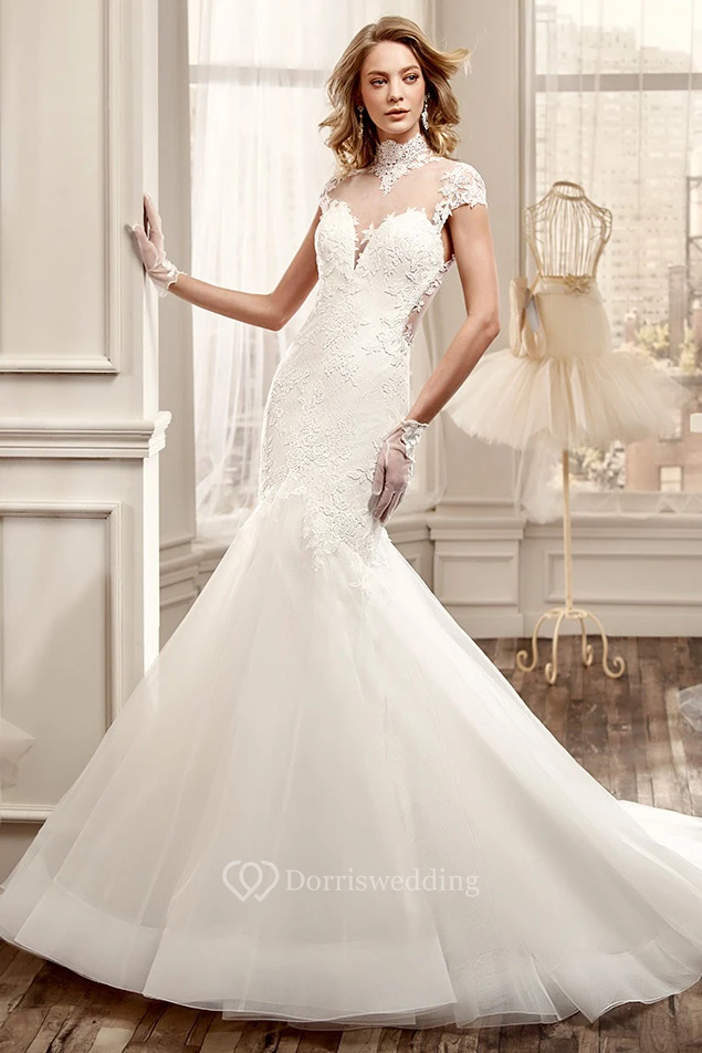 High-Neck Mermaid Wedding Dress with Illusive Back and Appliques