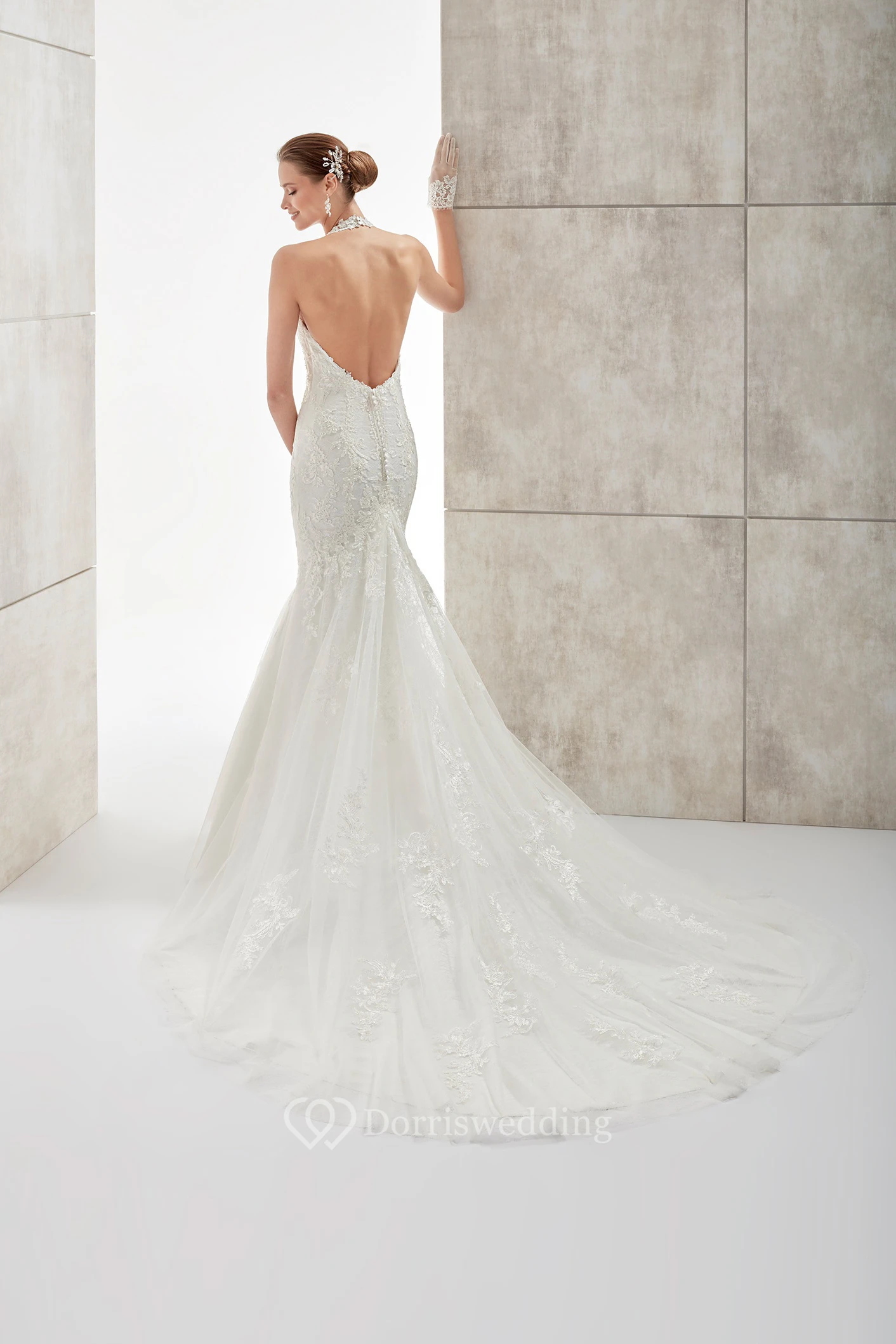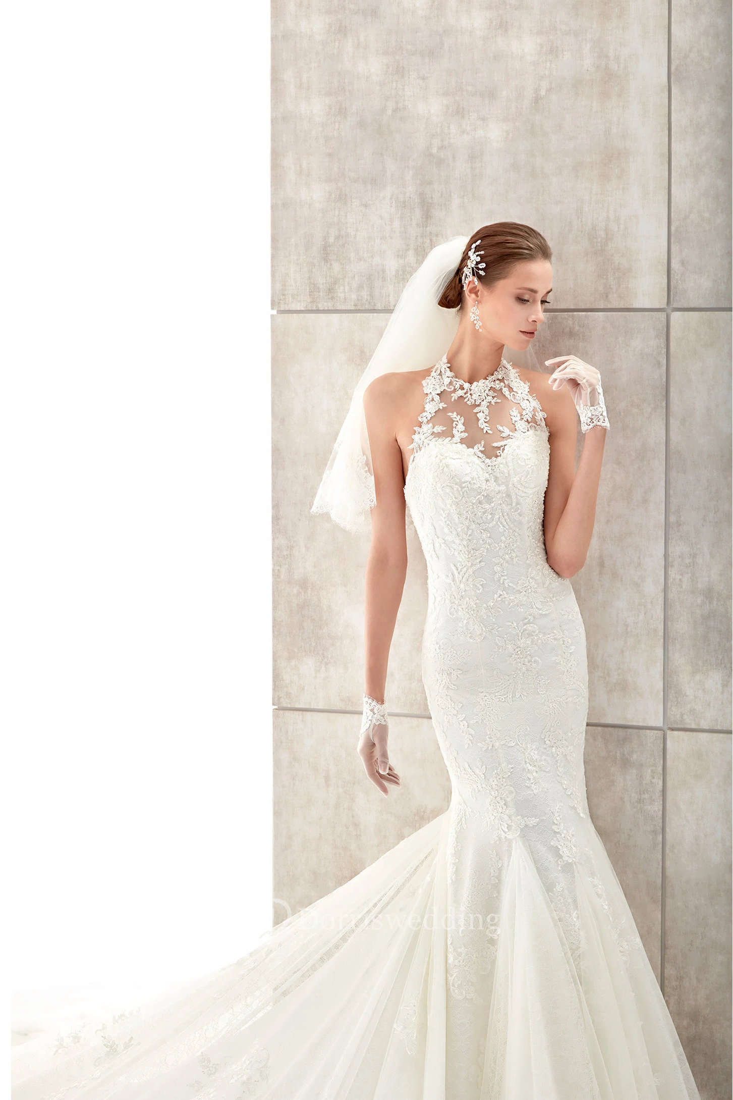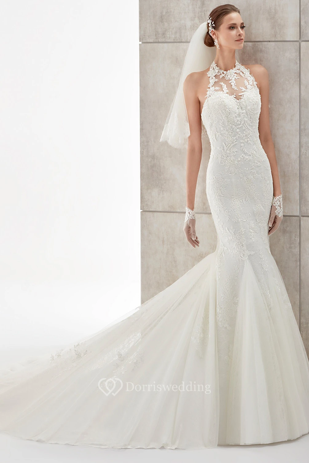 High-Neck Mermaid Wedding Dress with Illusive Neck and Backless Design