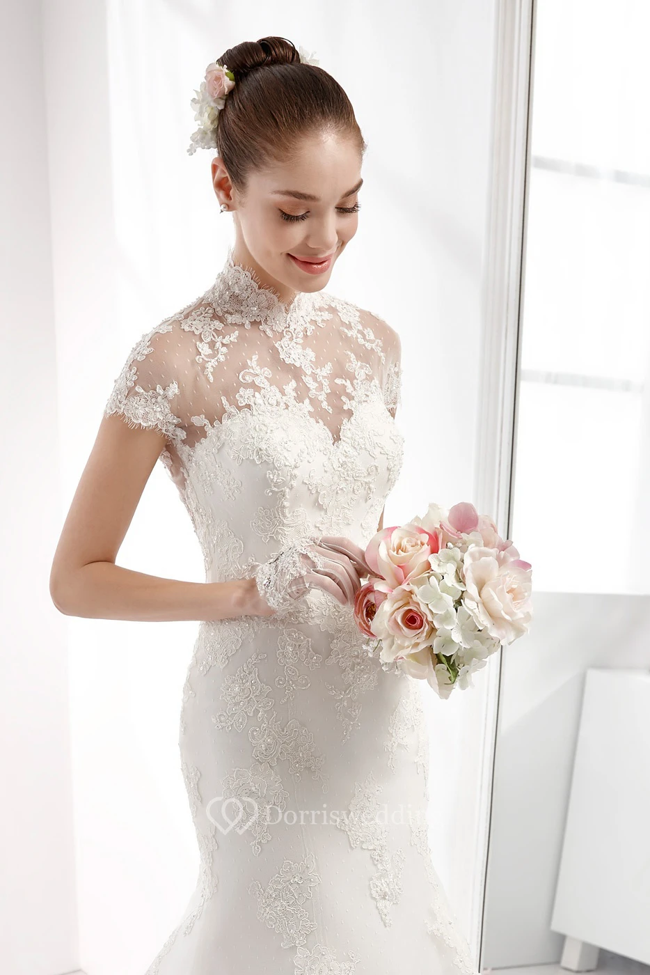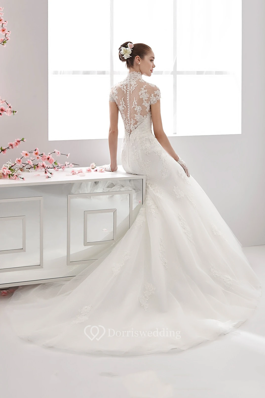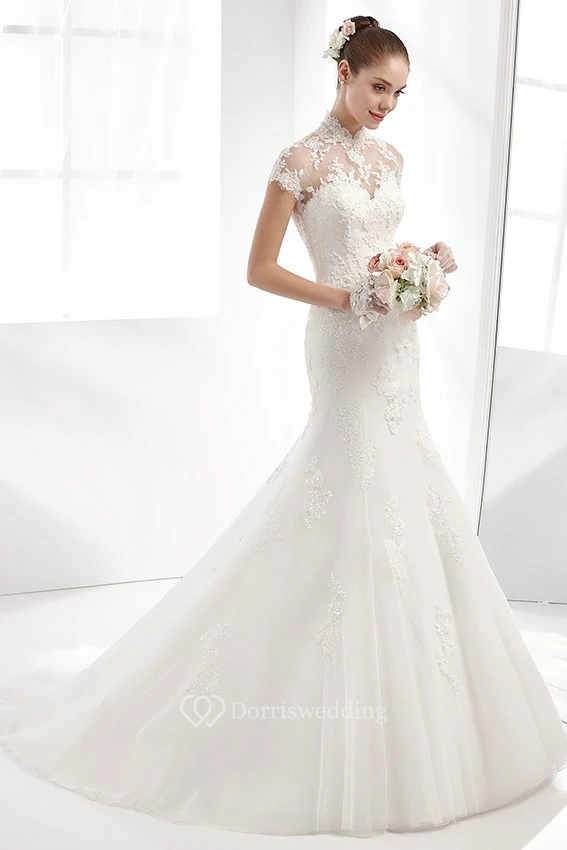 High-neck Mermaid Wedding Dress with T-shirt Sleeves and Illusive Design