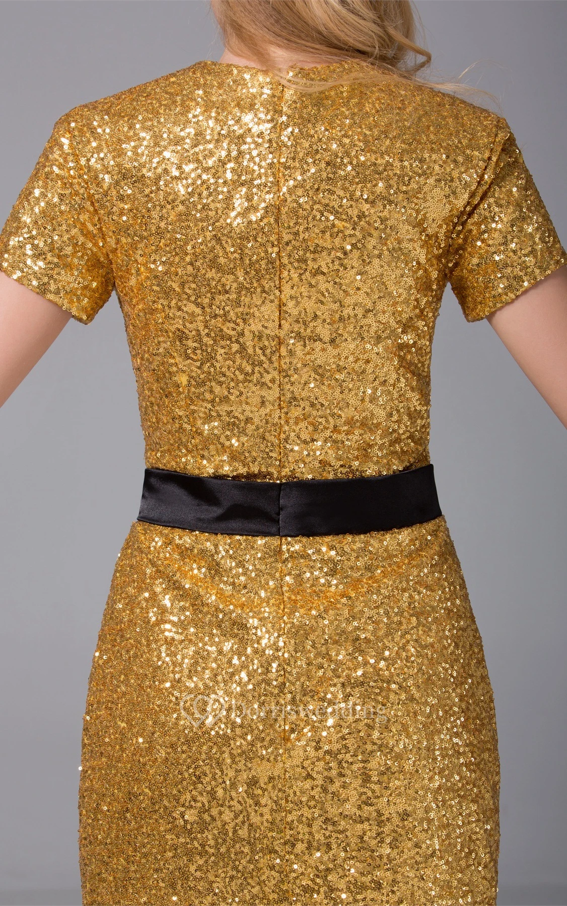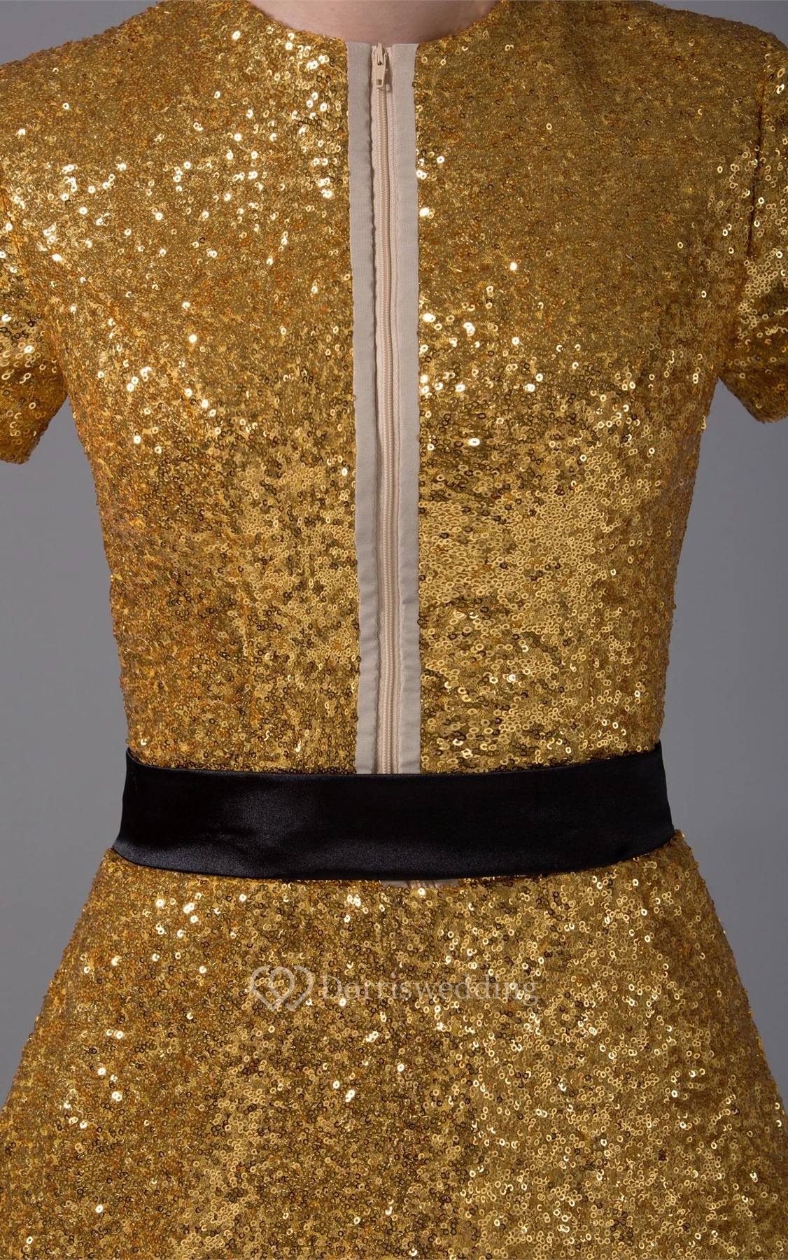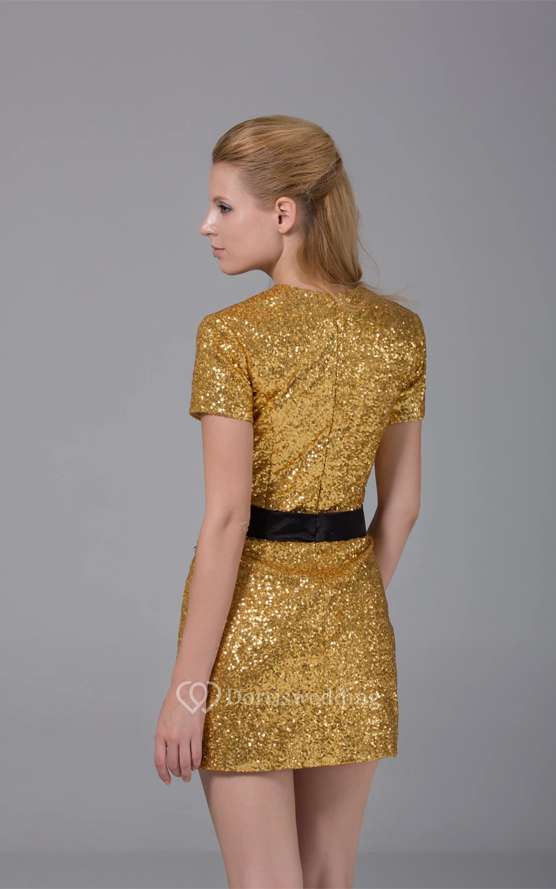 High-Neck Short Mini-Sleeve Sequins and Dress With Zipper