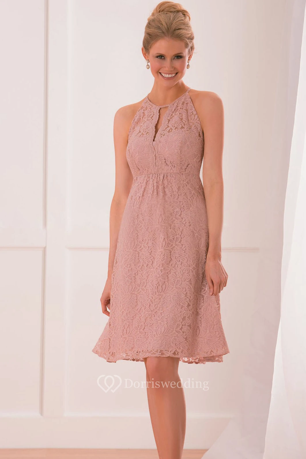 High-Neck Sleeveless Knee-Length Lace Bridesmaid Dress With Keyhole