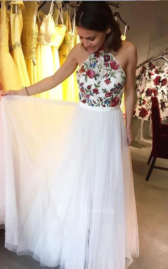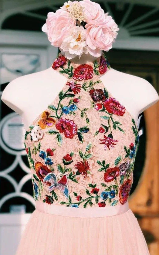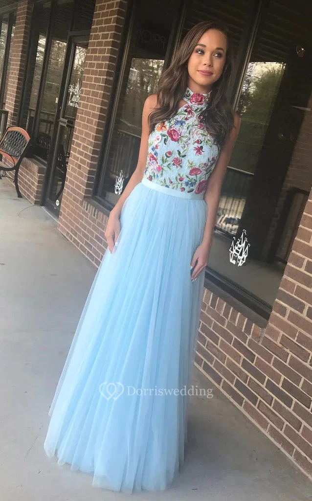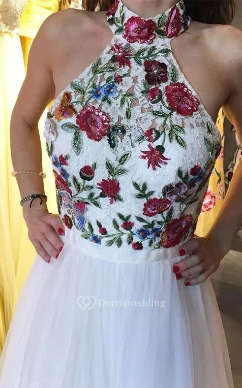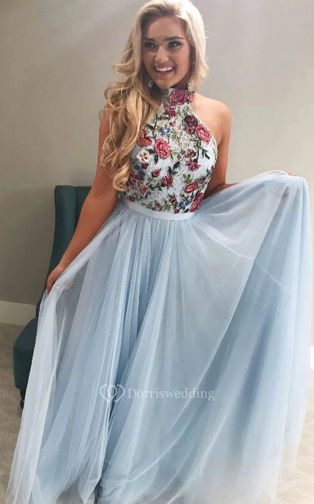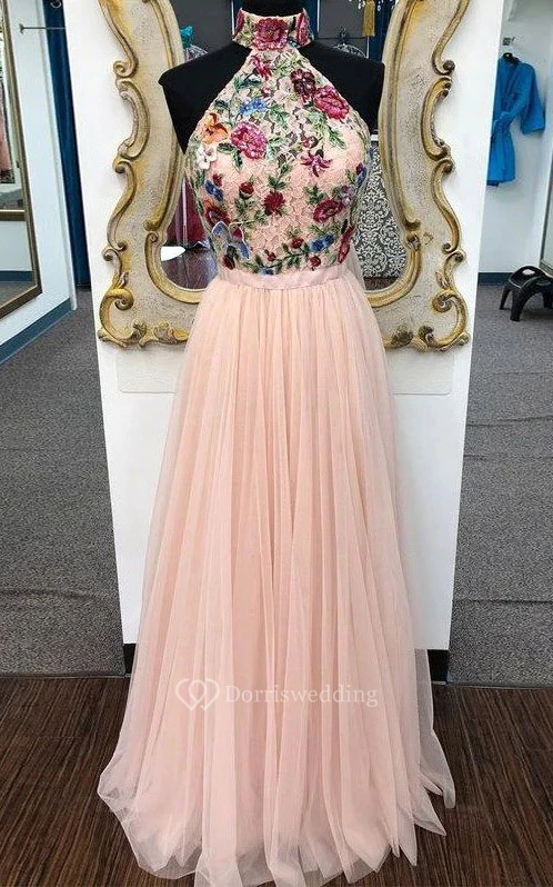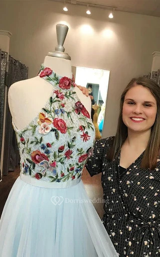 High-neck Sleeveless Tulle Empire Prom Dress with Floral Applique