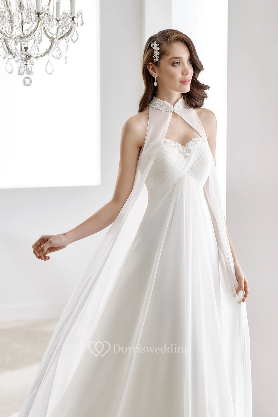 High-Neck Sweetheart Draping Chiffon Wedding Dress With Crisscross Bust And Beaded Details