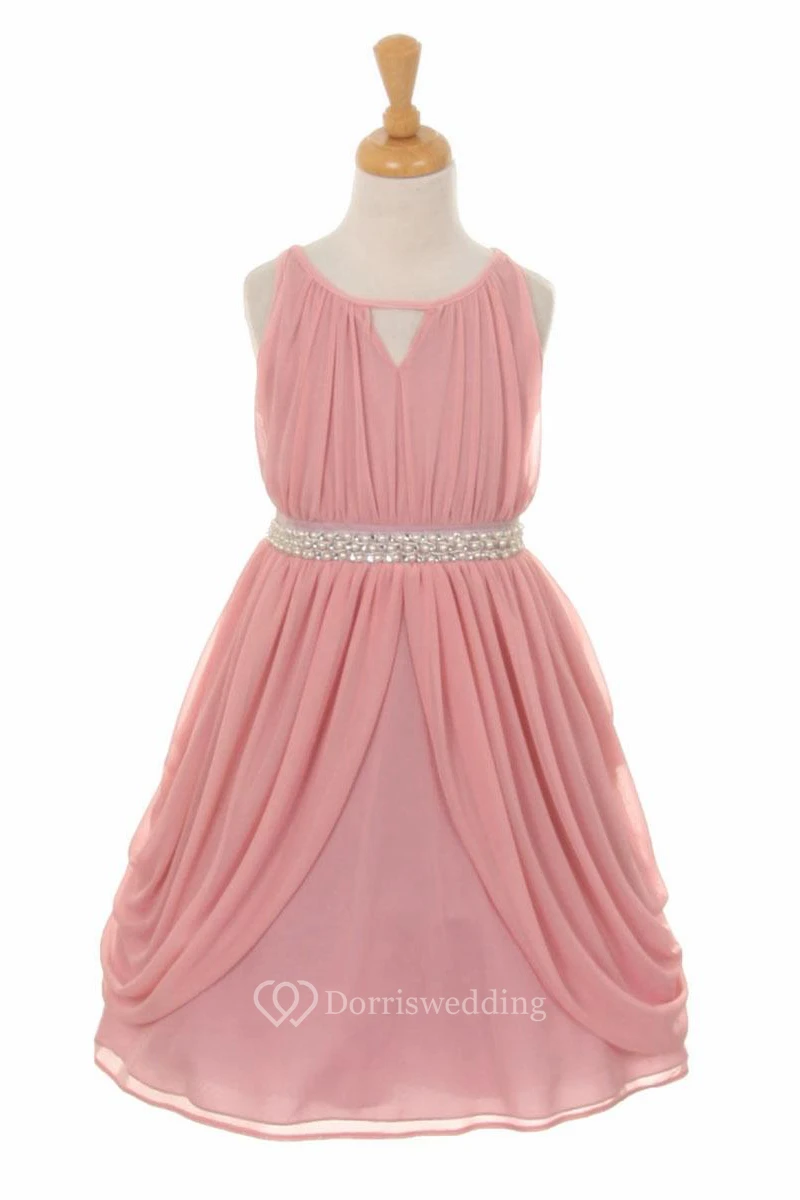 High Neck Tea-Length Pleated Tiered Chiffon Flower Girl Dress With Ribbon