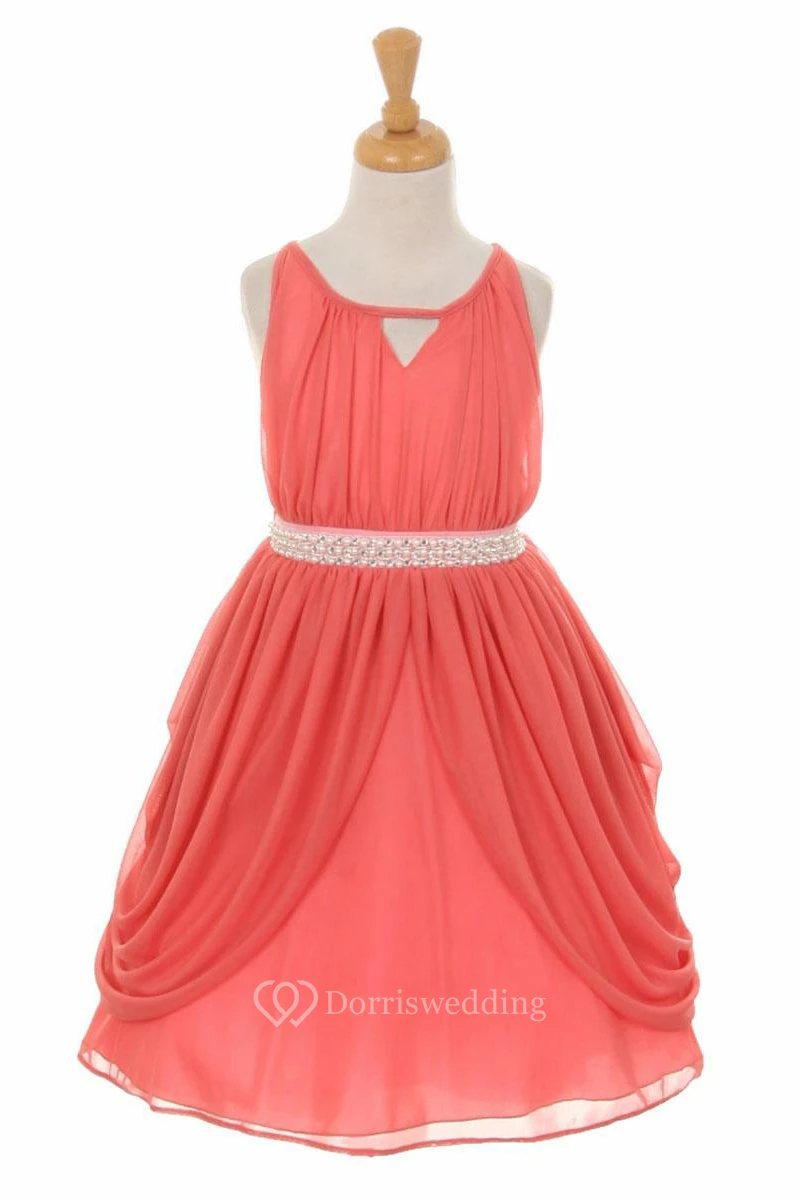 High Neck Tea-Length Pleated Tiered Chiffon Flower Girl Dress With Ribbon