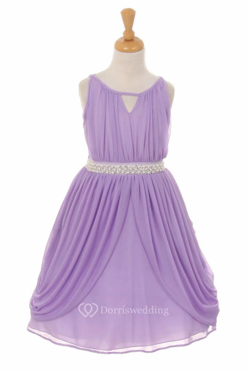 High Neck Tea-Length Tiered Pleated Chiffon Flower Girl Dress With Ribbon