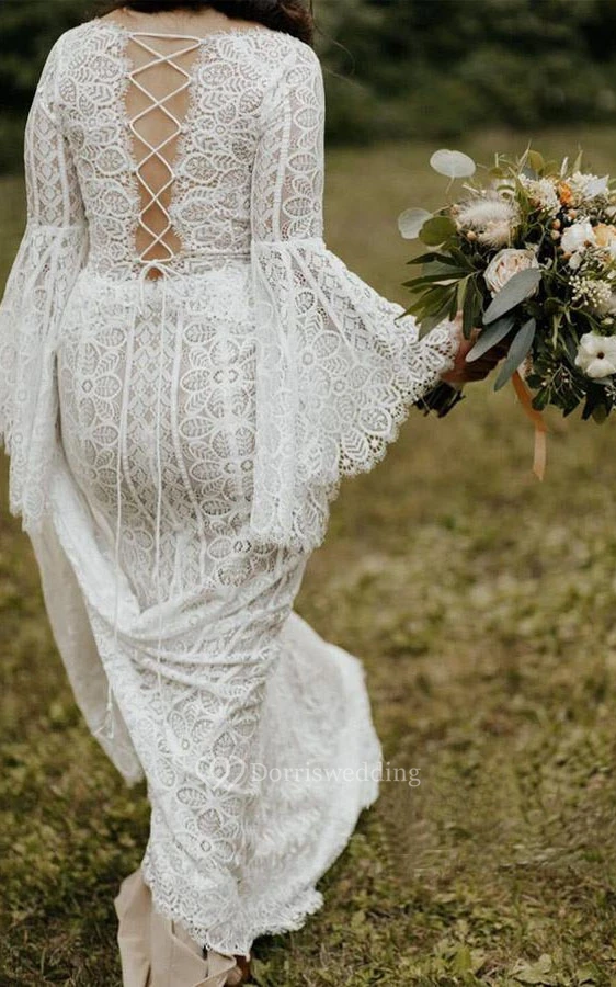 Hippie V-neck Puff-long-sleeve Sheath Corset Back Country Wedding Dress