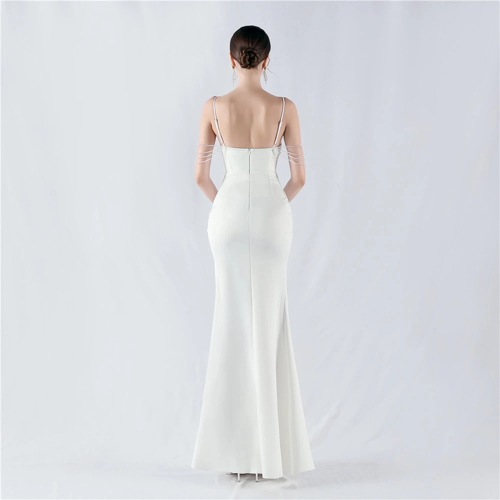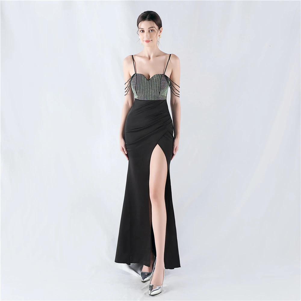 Hot Diamond Beaded High-Slit Satin Sexy Sling Evening Dress