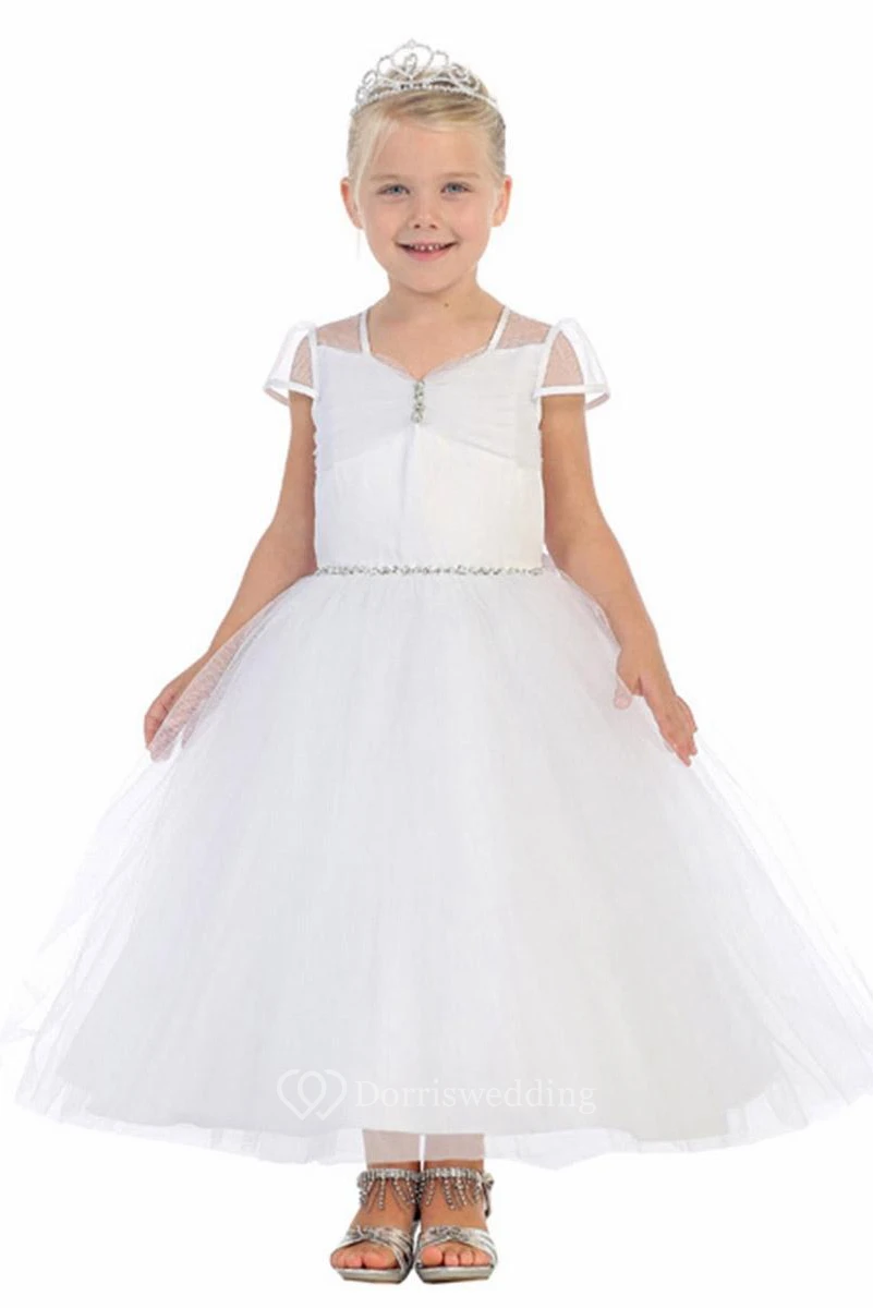 Illusion Ankle-Length Ruched Tiered Tulle Flower Girl Dress With Sash