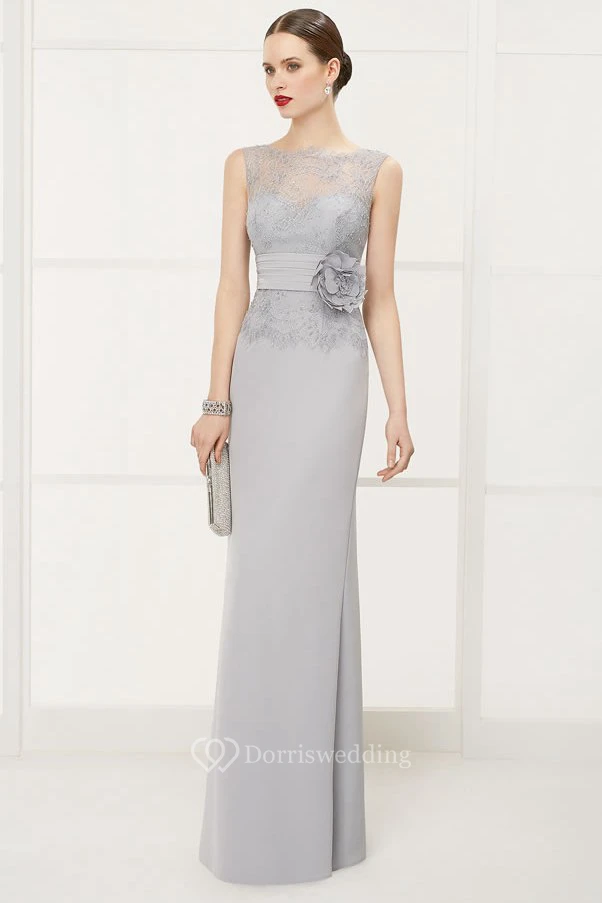 Illusion Bateau Sleeveless Sheath Long Dress With Lace Top And Waist Flower