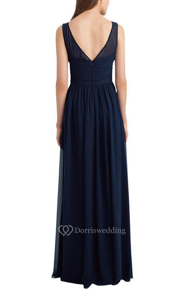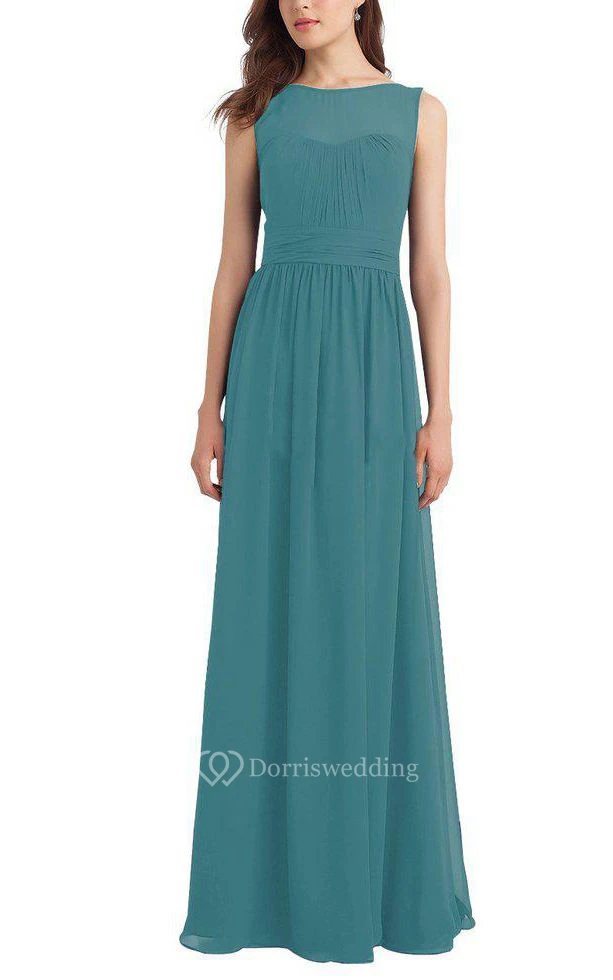 Illusion Chiffon Ruched Long Bridesmaid Dress