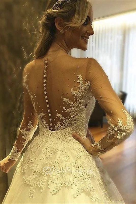 Illusion Deep V Neck Pearls Beaded Backless Sheer See Through Lace Princess Wedding Dress