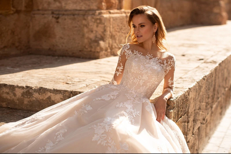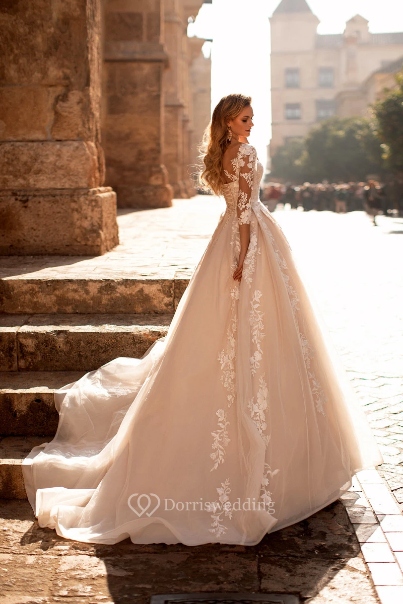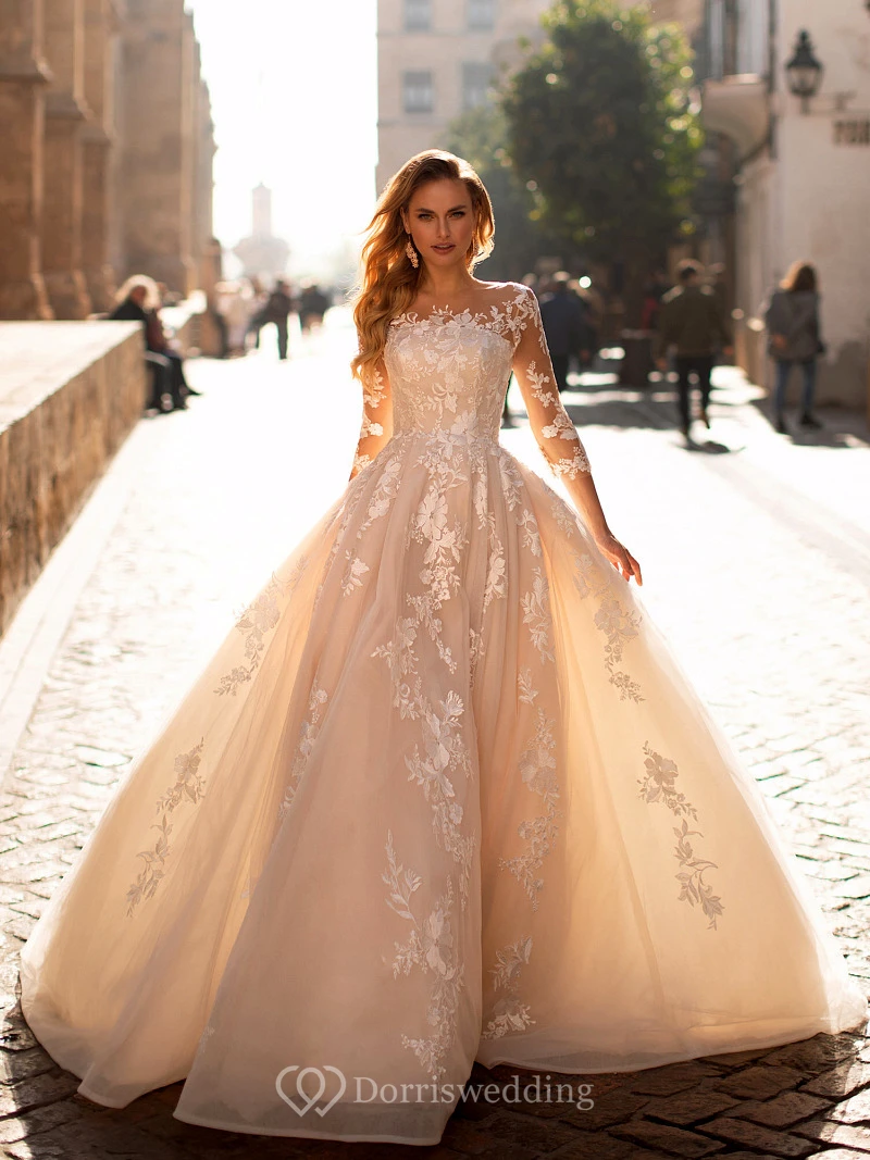 Illusion Elegant Ball Gown Lace Applique Wedding Dress