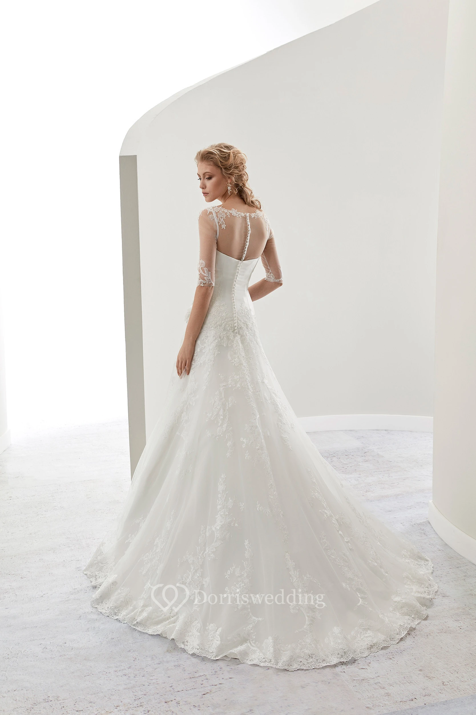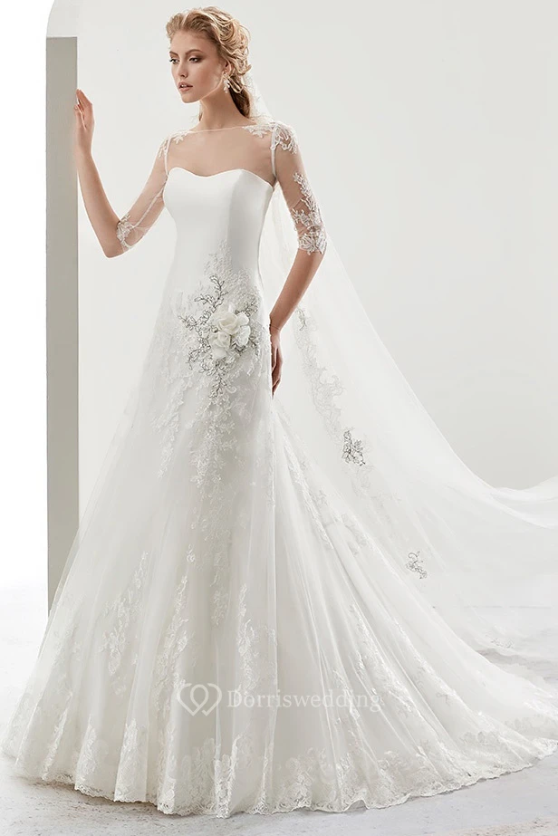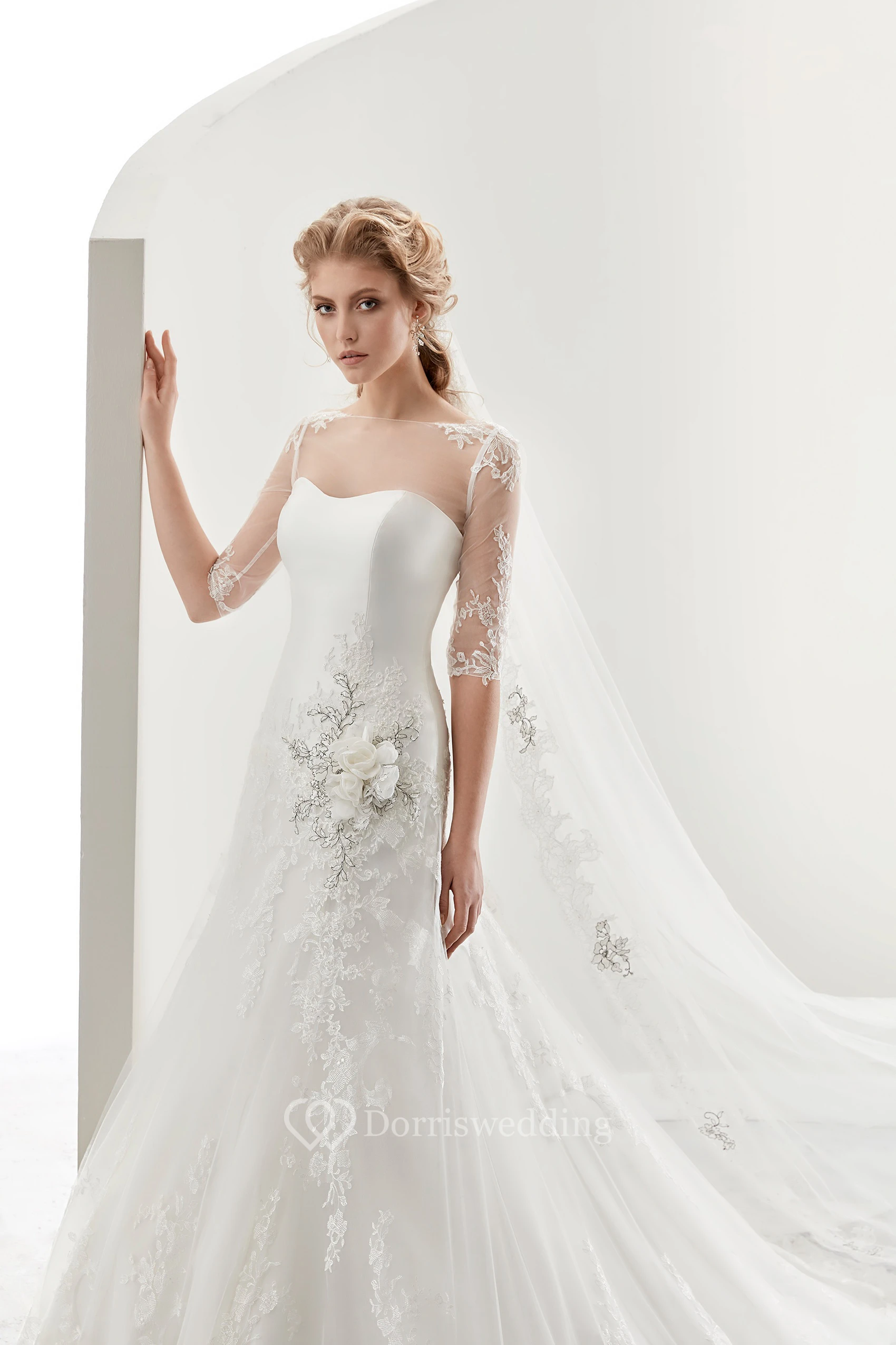 Illusion Half-sleeve Bridal Gown with Beaded Flower Embellishment and Jewel Neck