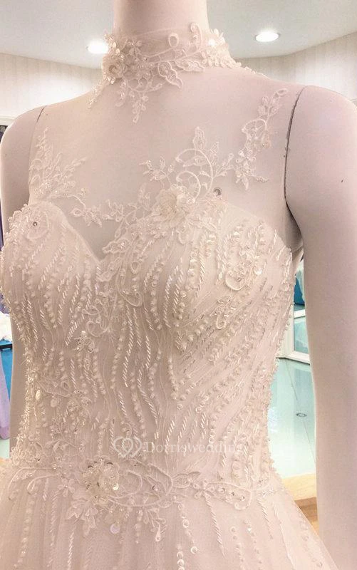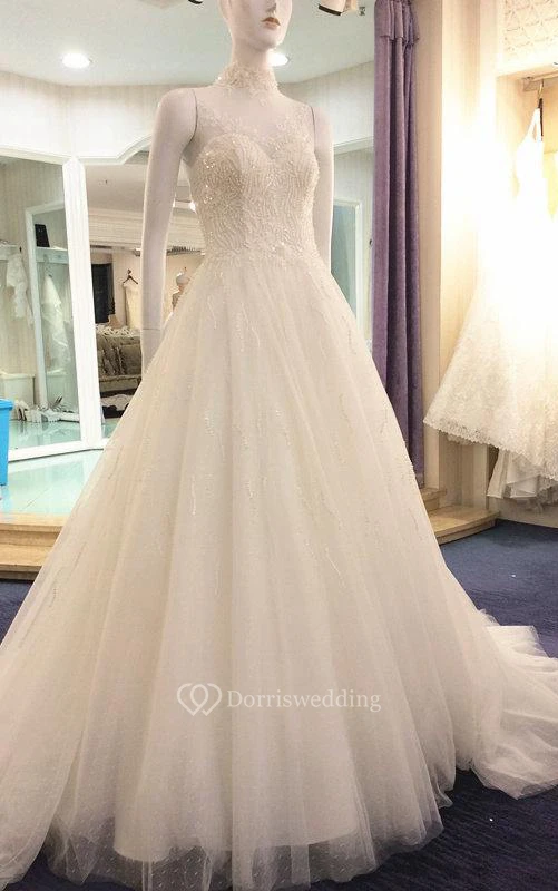 Illusion High Neck Sleeveless A-Line Tulle Dress With Beaded Bodice