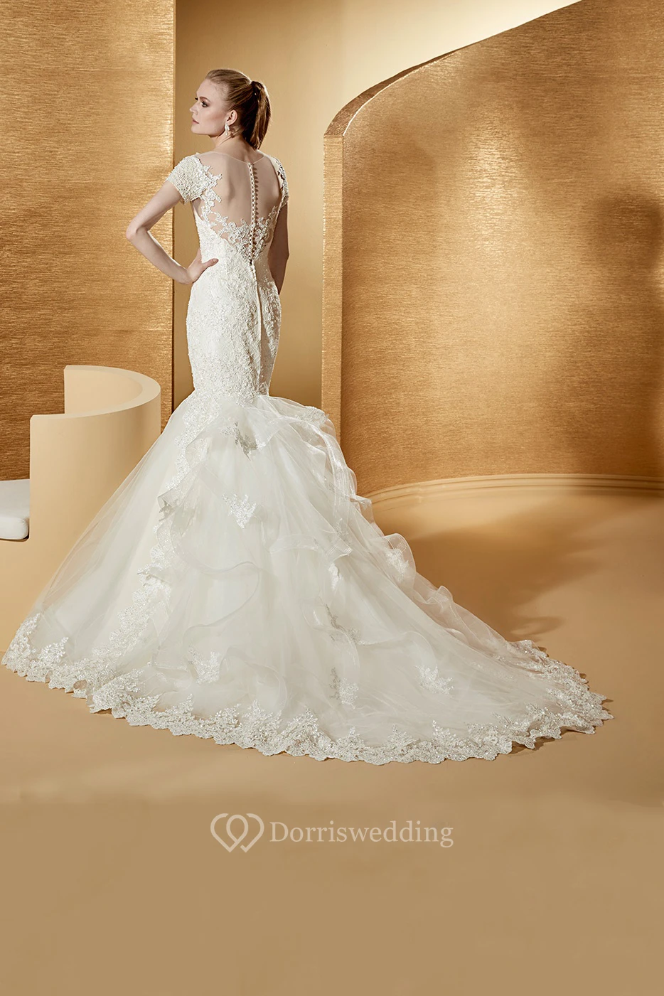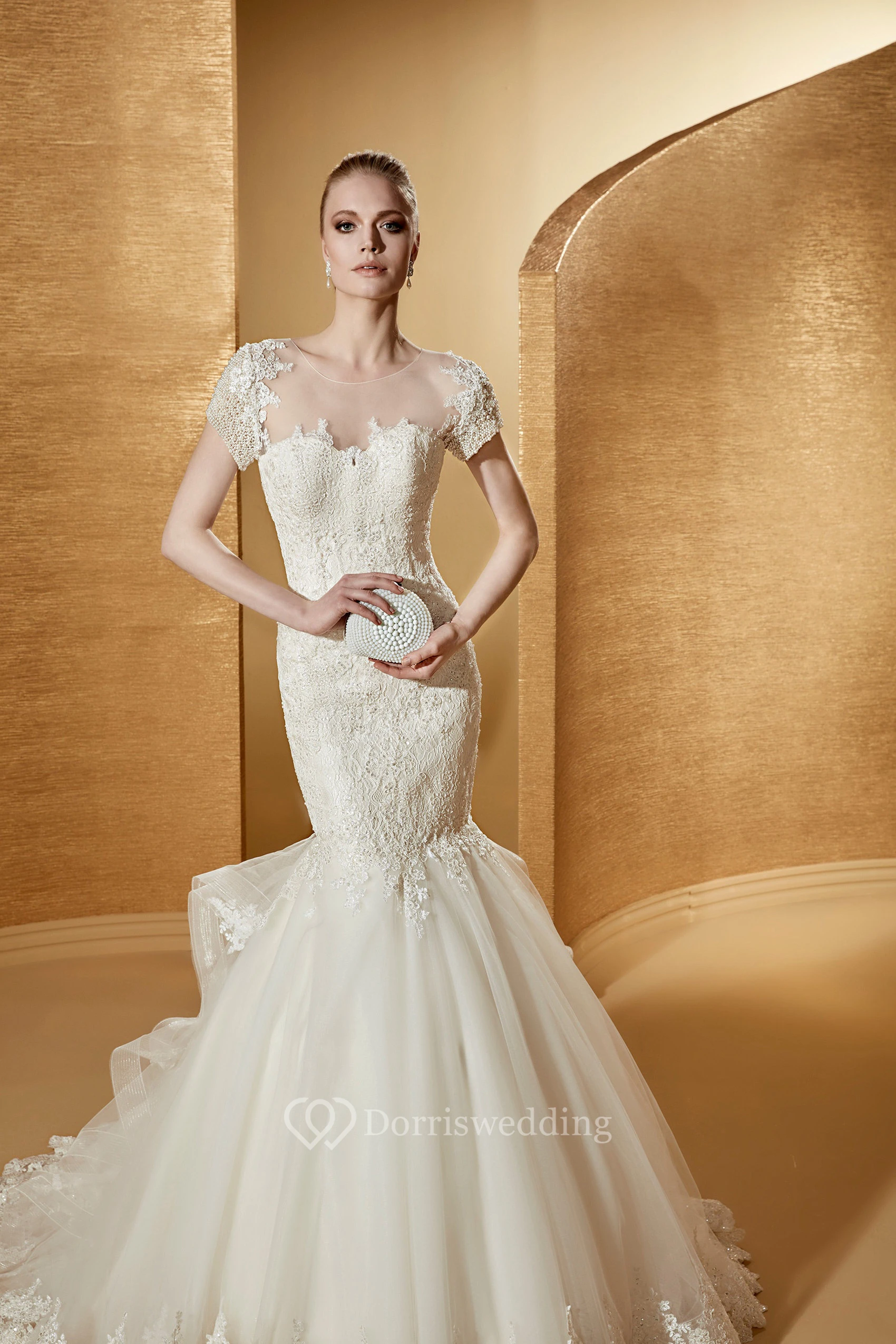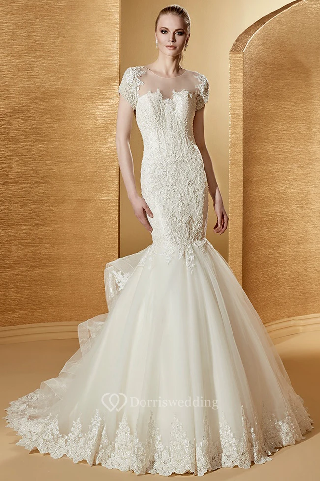 Illusion Jewel-Neck Mermaid Lace Gown With T-Shirt Sleeves And Ruching Train