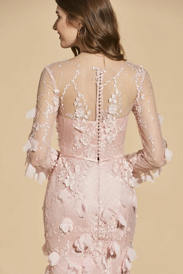 Illusion Long Sleeve And Floral Appliques Mini Skirt Bodycon Dress With Bow And Sash