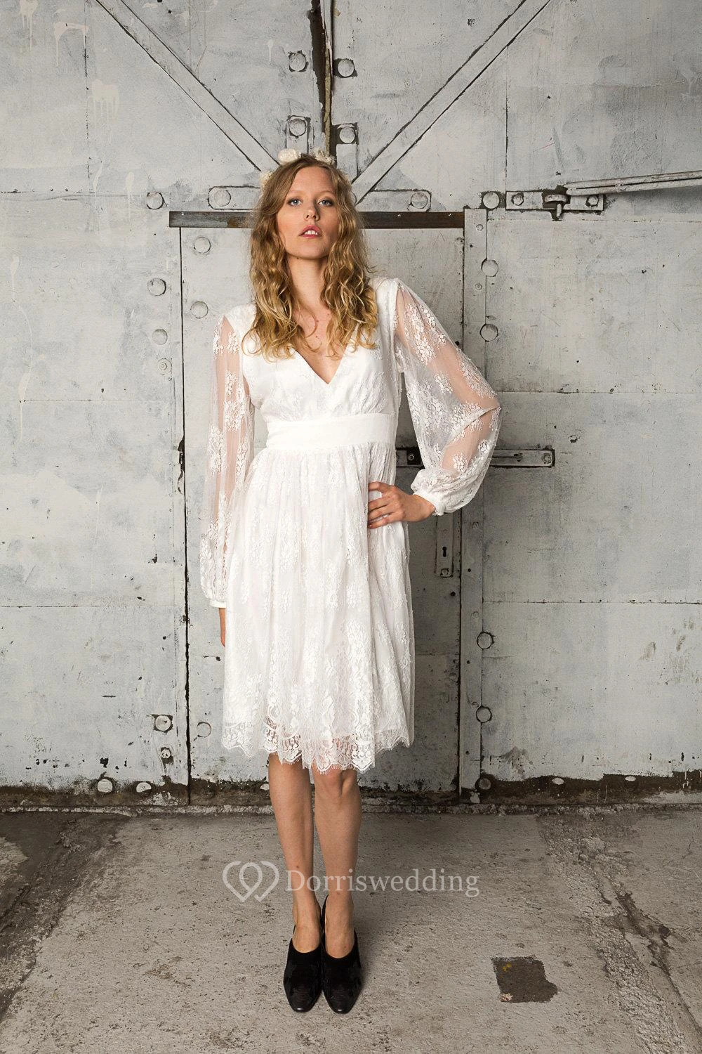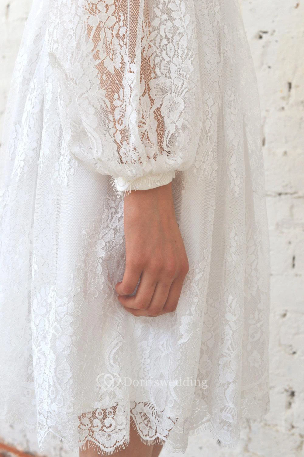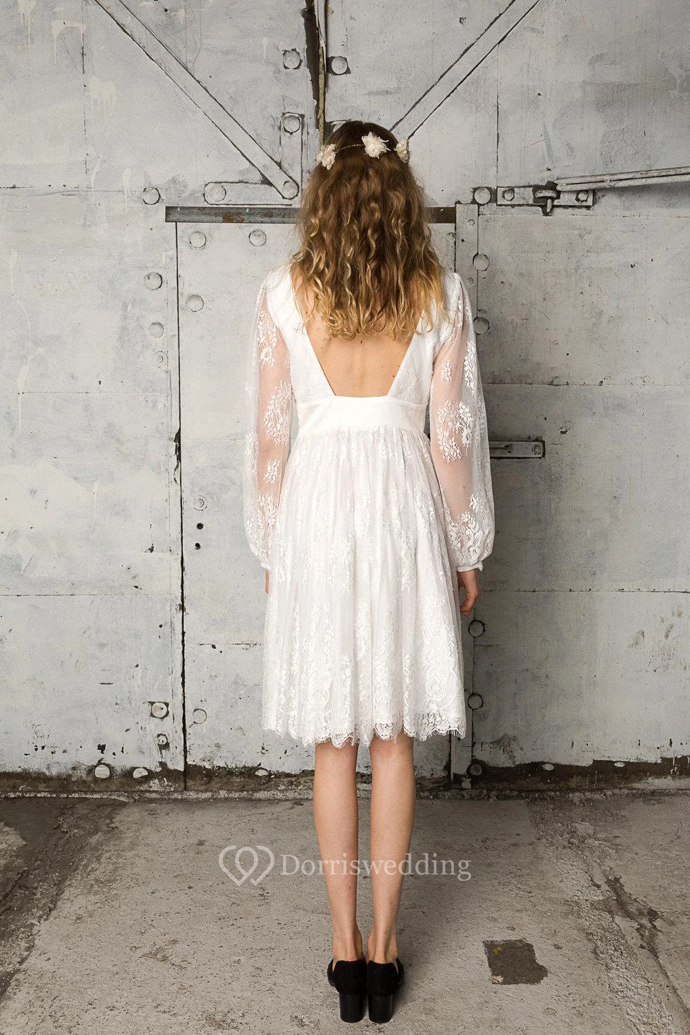 Illusion Long Sleeve V-Neck Knee Length Lace Vow Renewal Dress With Open Back