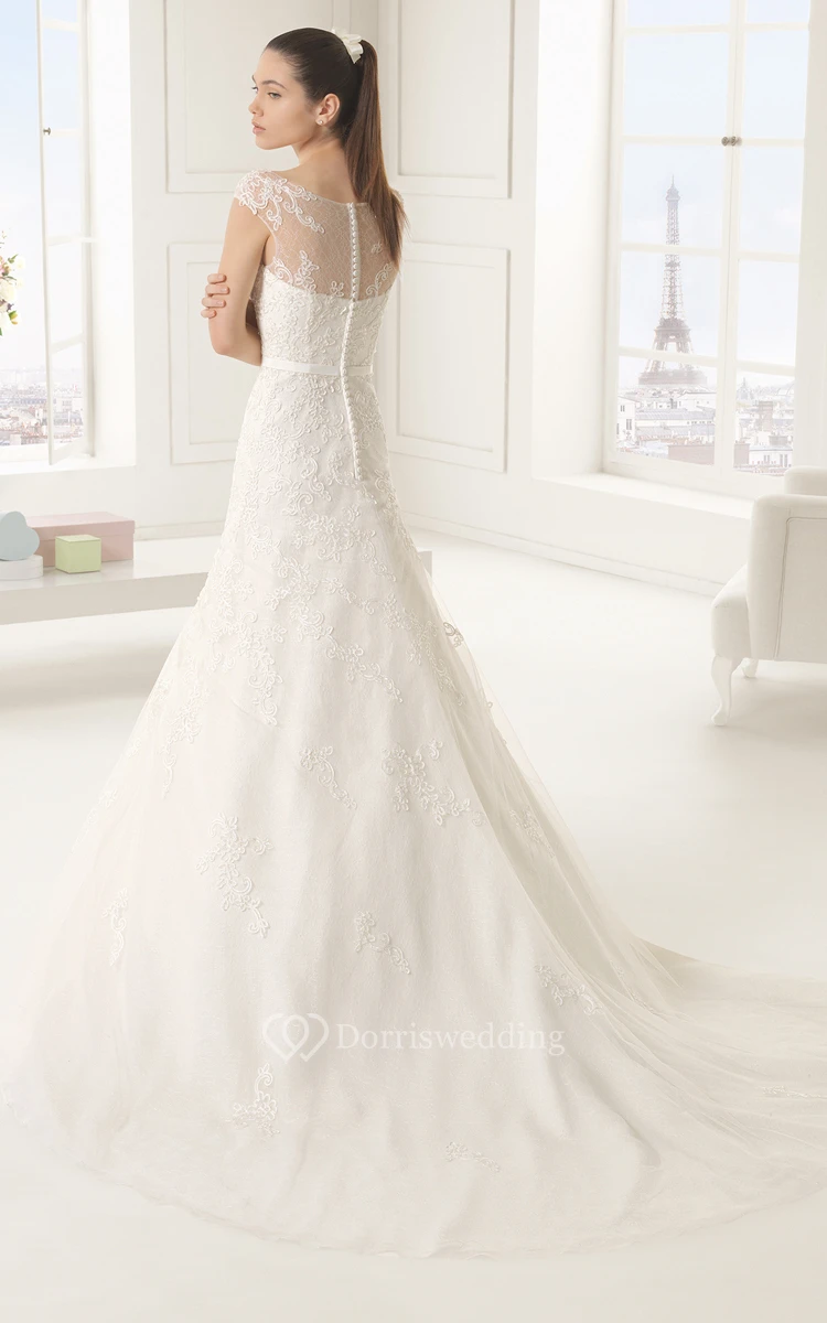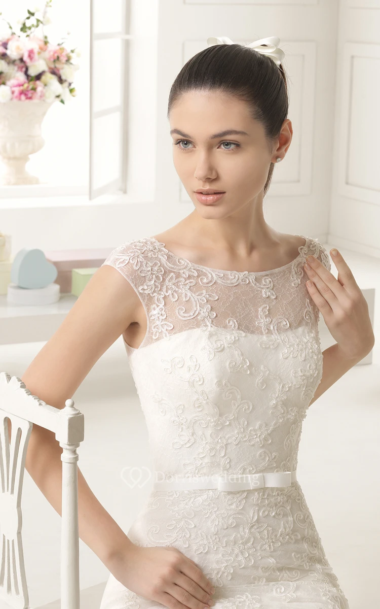Illusion-Neck Back Appliqued Gown With Slim Bow Belt