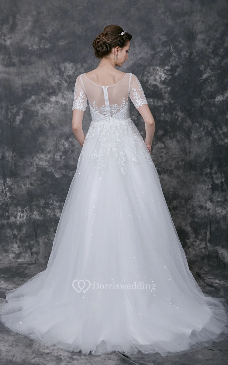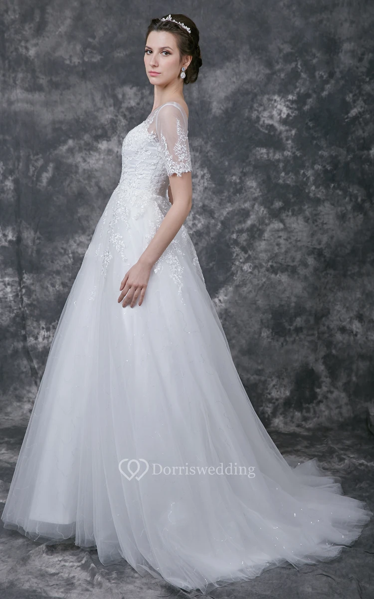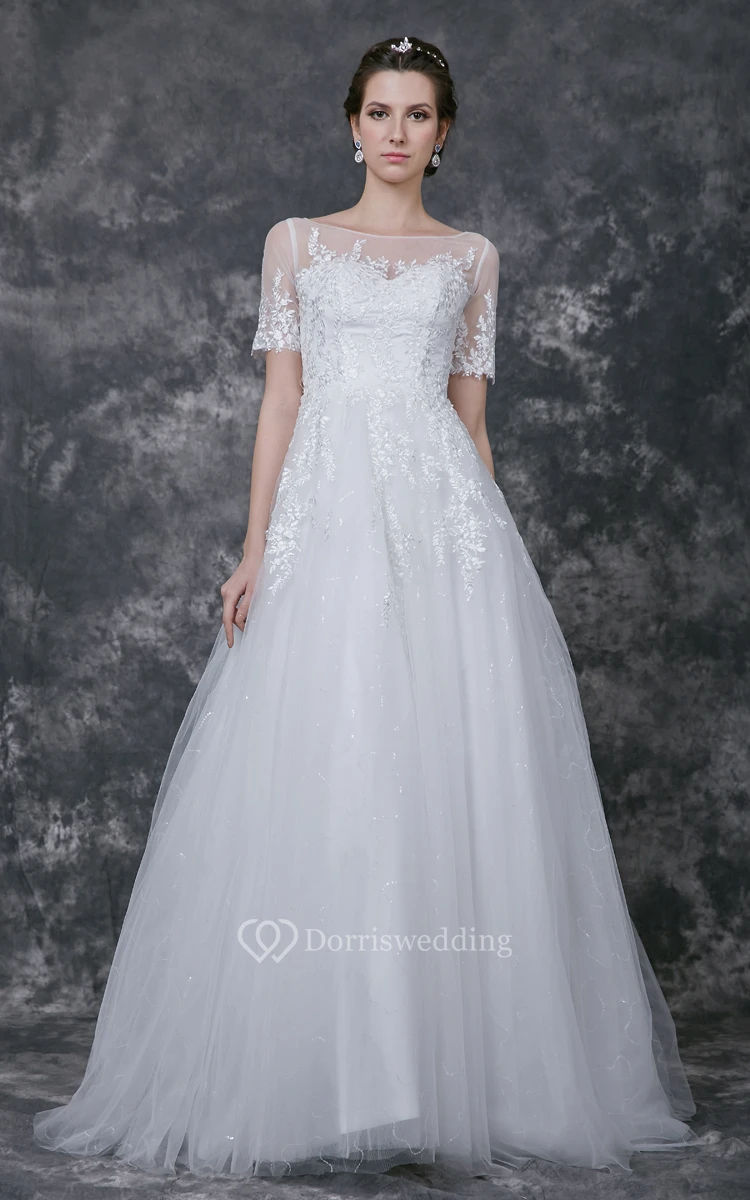 Illusion Short Lace Sleeve Bateau Neck A-line Tulle Gown