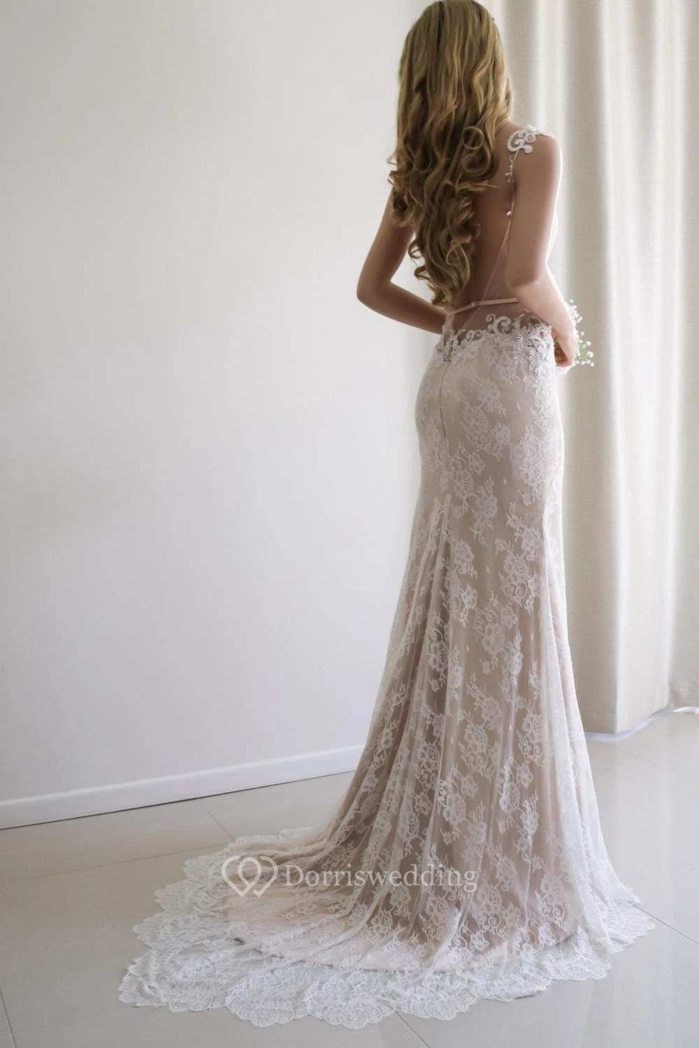 Illusion Sleeve Satin Lace Backless Wedding Dress
