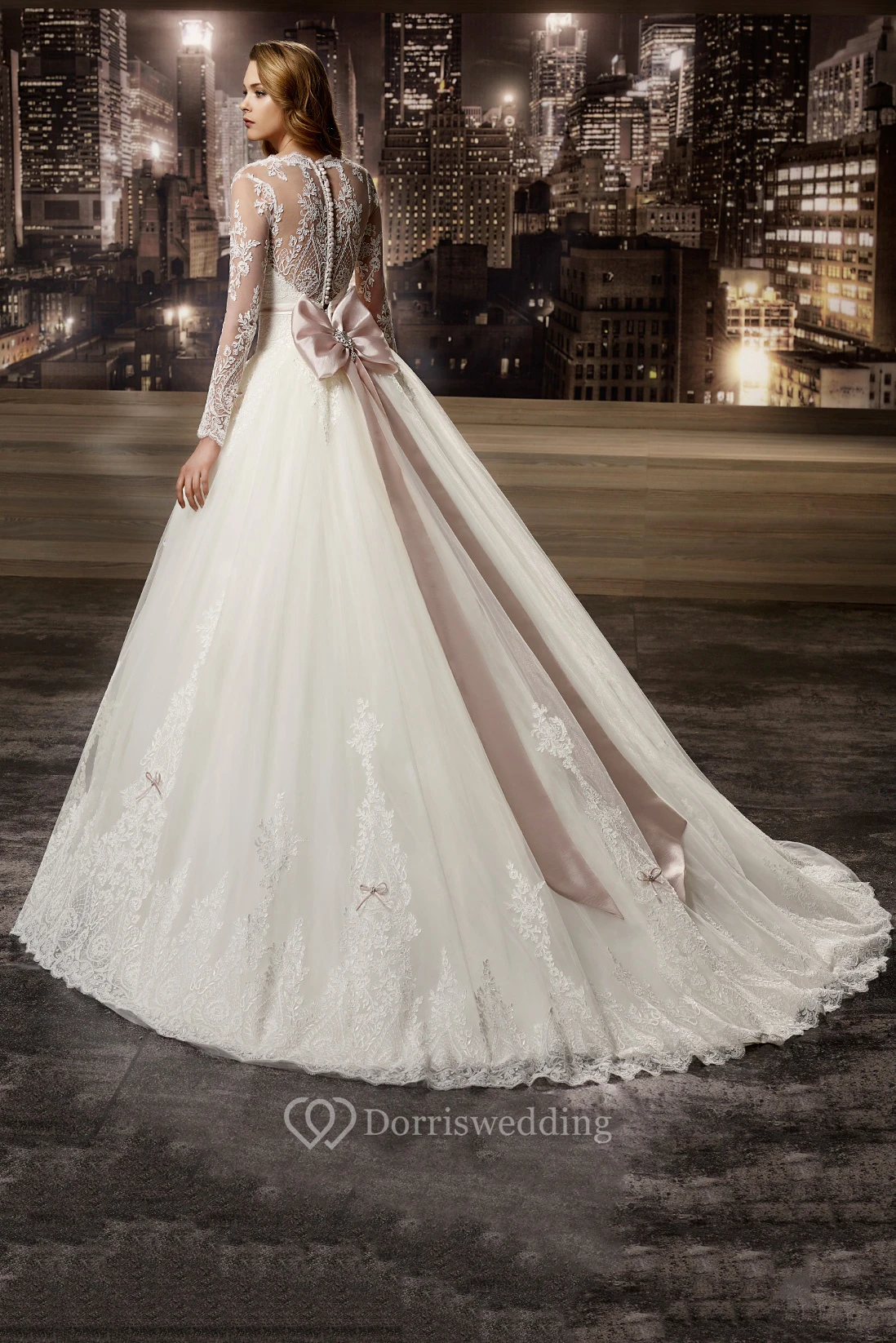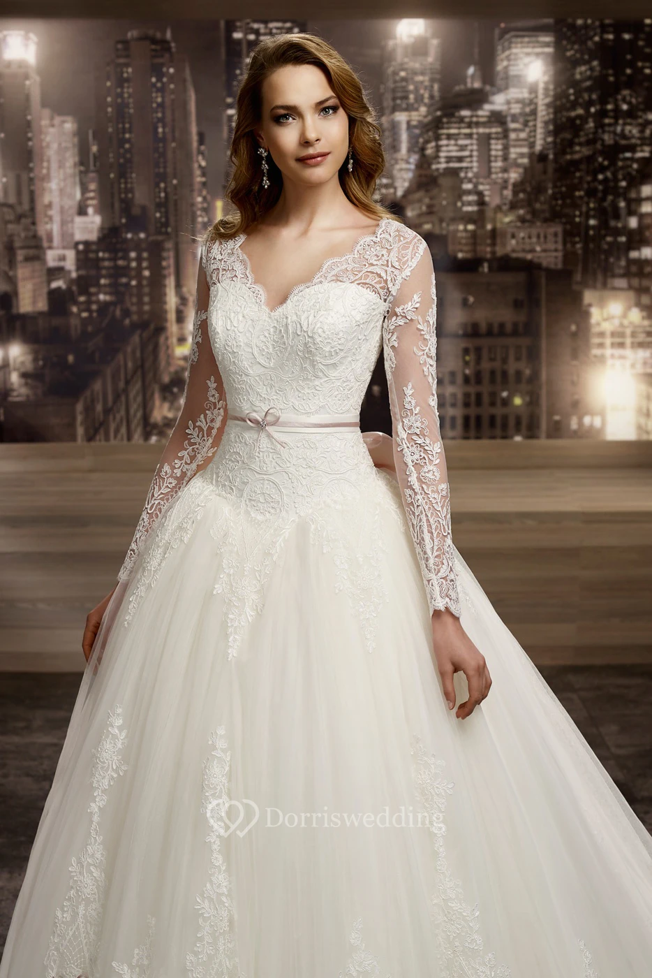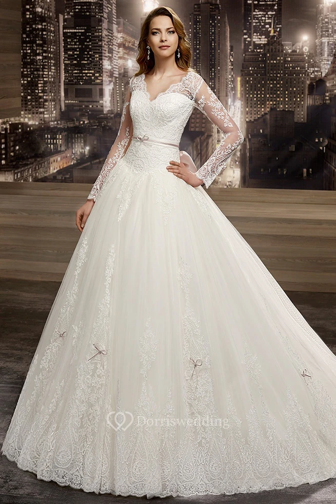 Illusion V-neck A-line Wedding Dress with Long Sleeves and Back Bow