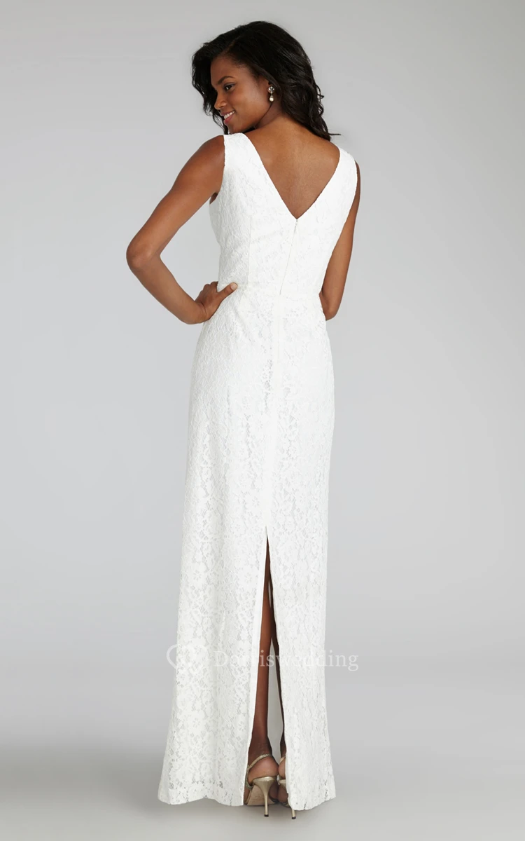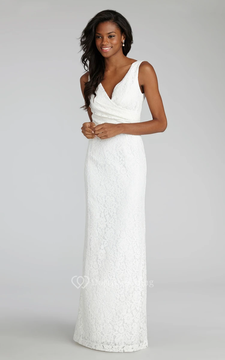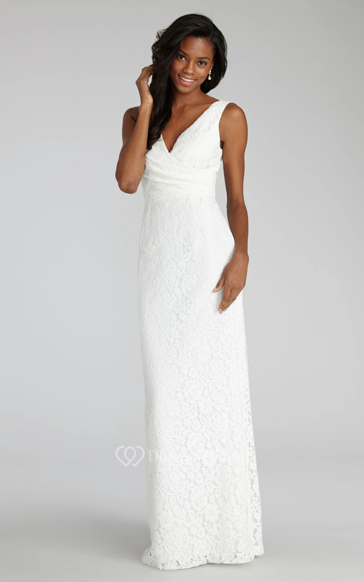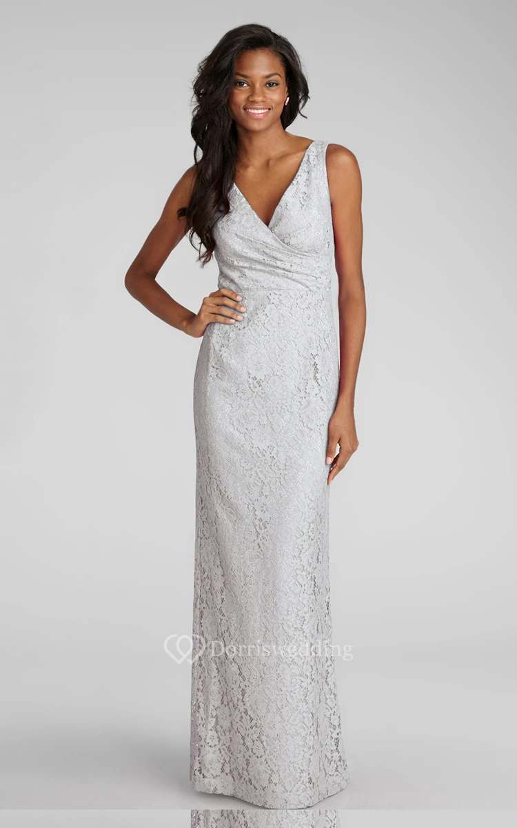 Impressive Sheath Floor-length Lace Dress with V-neck and Criss Crossed Ruching