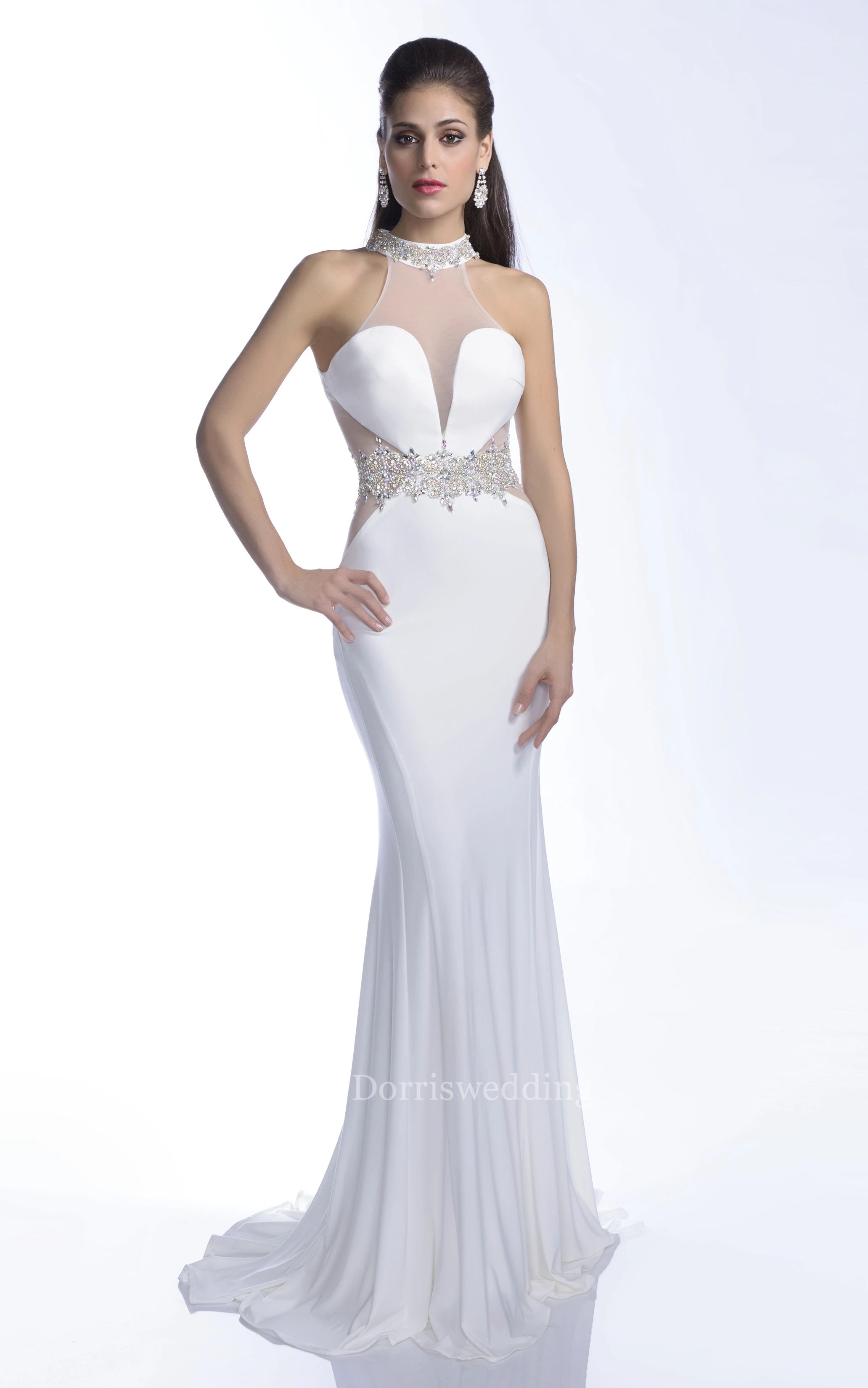 Jersey Mermaid Sleeveless Keyhole Back Prom Dress With Crystal Halter And Waistband