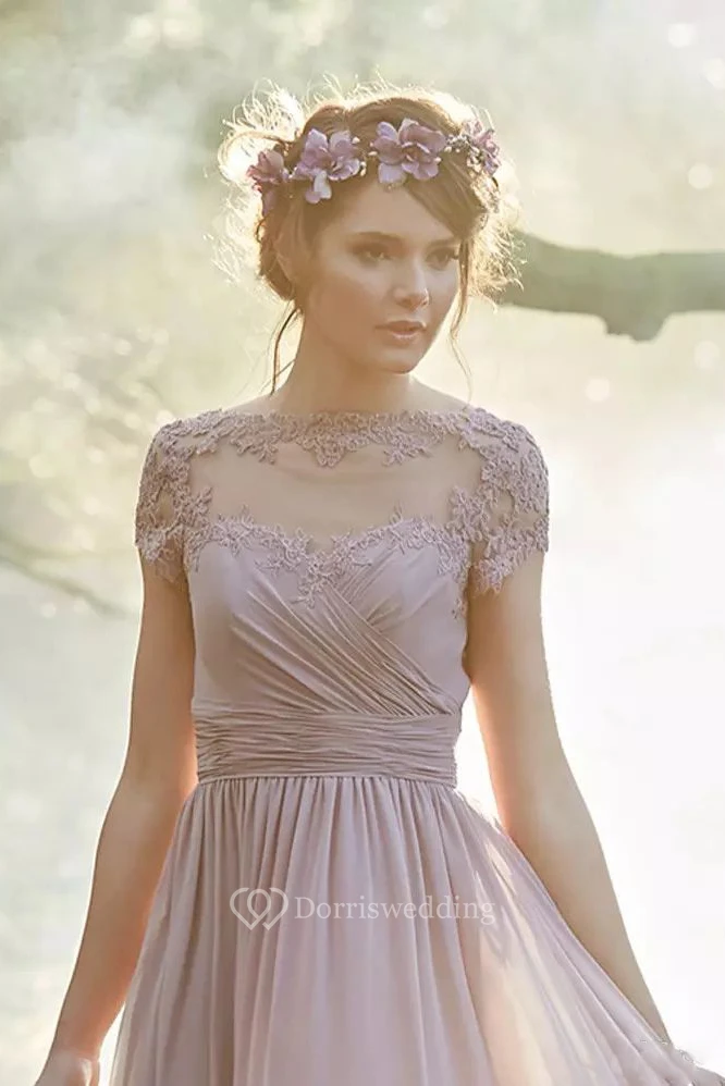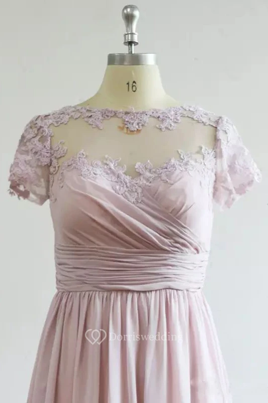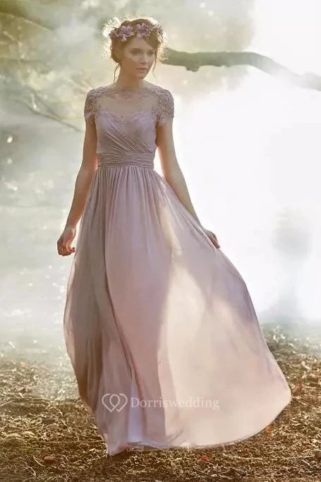 Jewel A-line Floor-length Short Sleeve Chiffon Bridesmaid Dress with Zipper Low-V Back