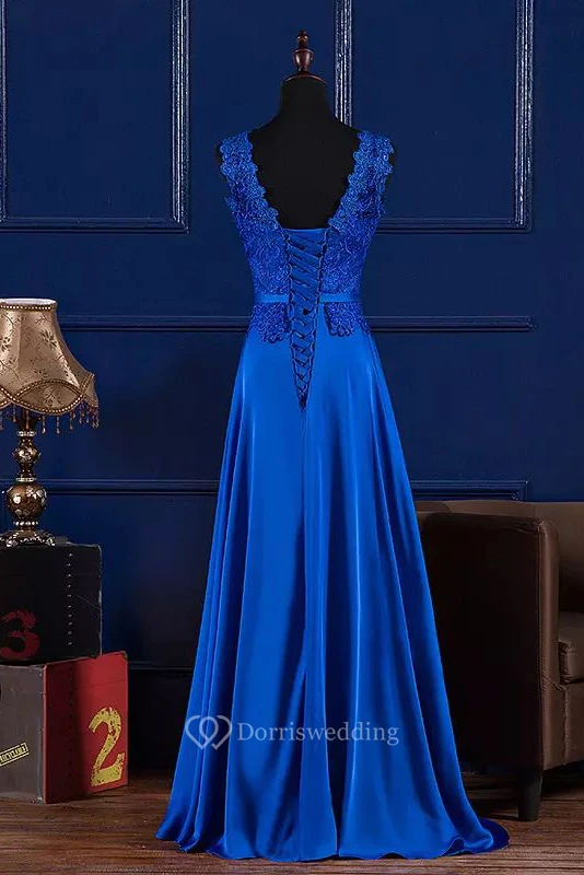 Jewel A-line Floor-length Sleeveless Satin Lace Modest Bridesmaid Dress with Lace-up Back