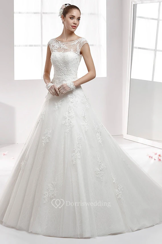 Jewel-Neck A-Line Gown With Cap Sleeve And Backless Design