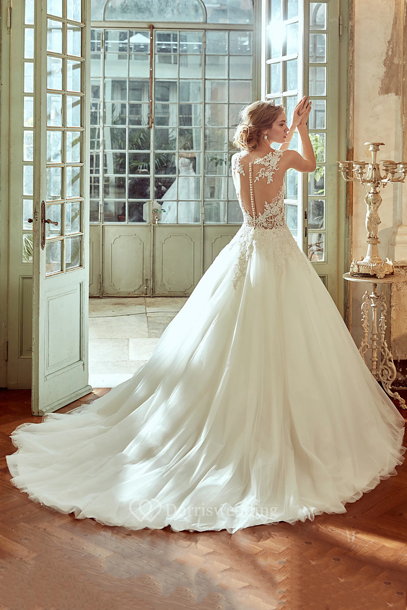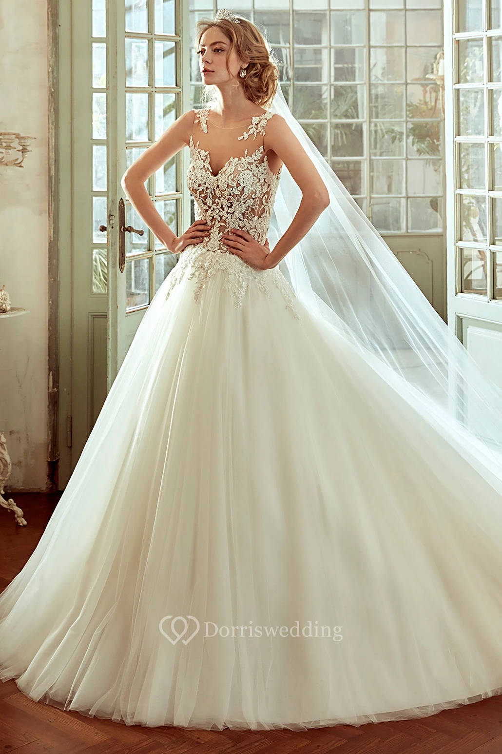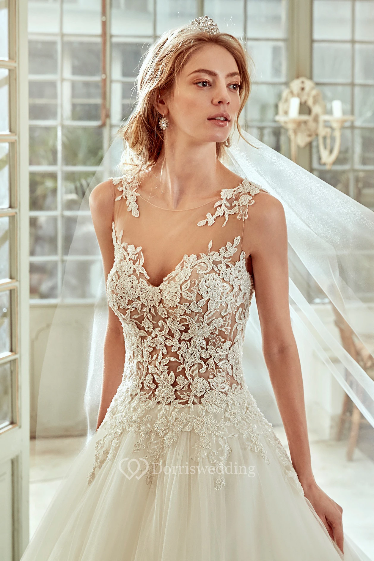 Jewel-Neck A-Line Gown With Illusive Bodice And Multi-Layer Tulle Skirt