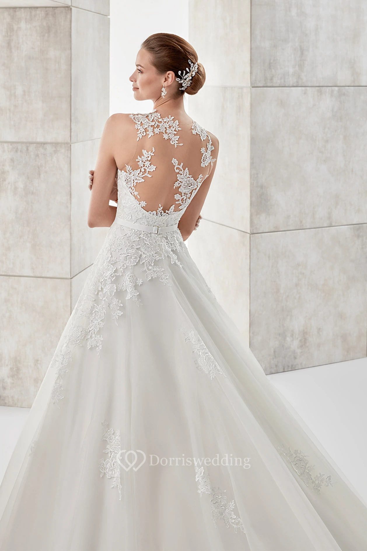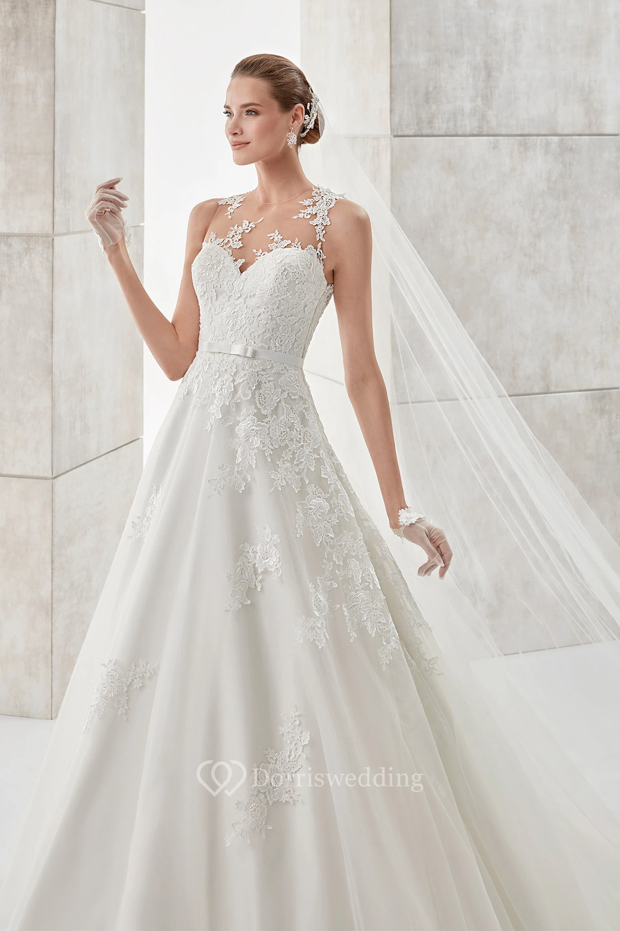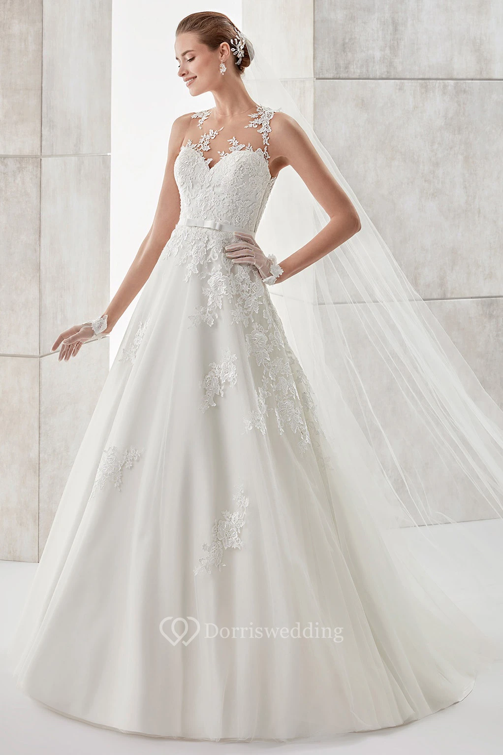 Jewel-neck A-line Illusive Wedding Dress with Lace Appliques and Satin Sash